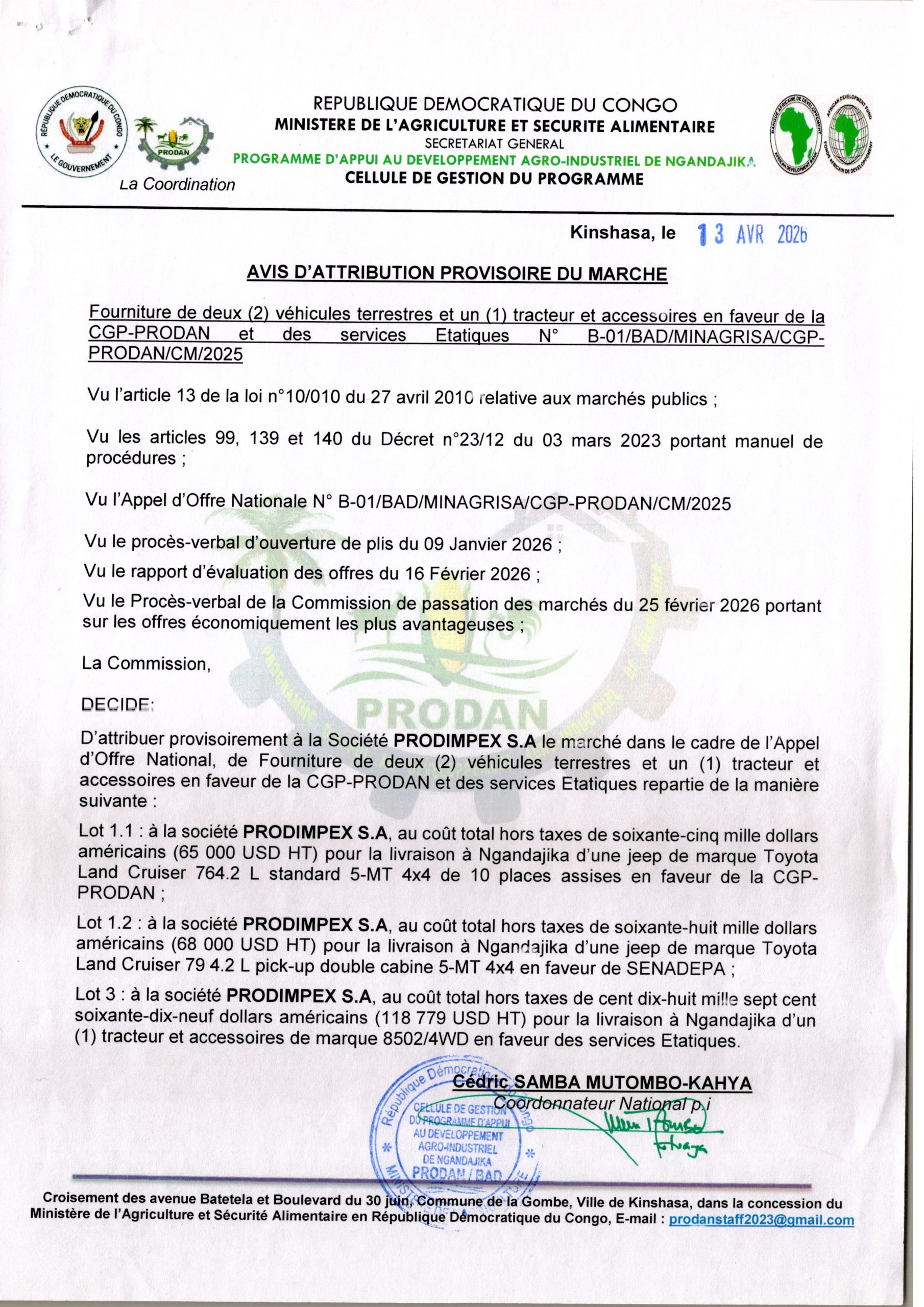 Attribution provisoire accordée à la société PRODIMPEX S.A (lot 1,2 et 3) relative à la fourniture de deux (2) véhicules terrestres et un (1) tracteur et accessoires en faveur de la CGP-PRODAN et des services Etatiques.
