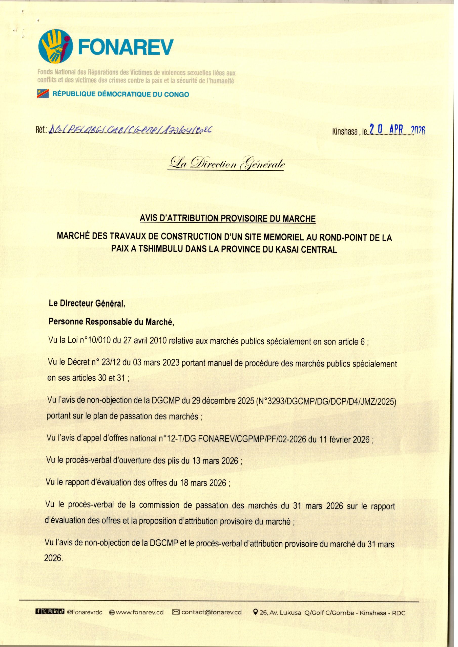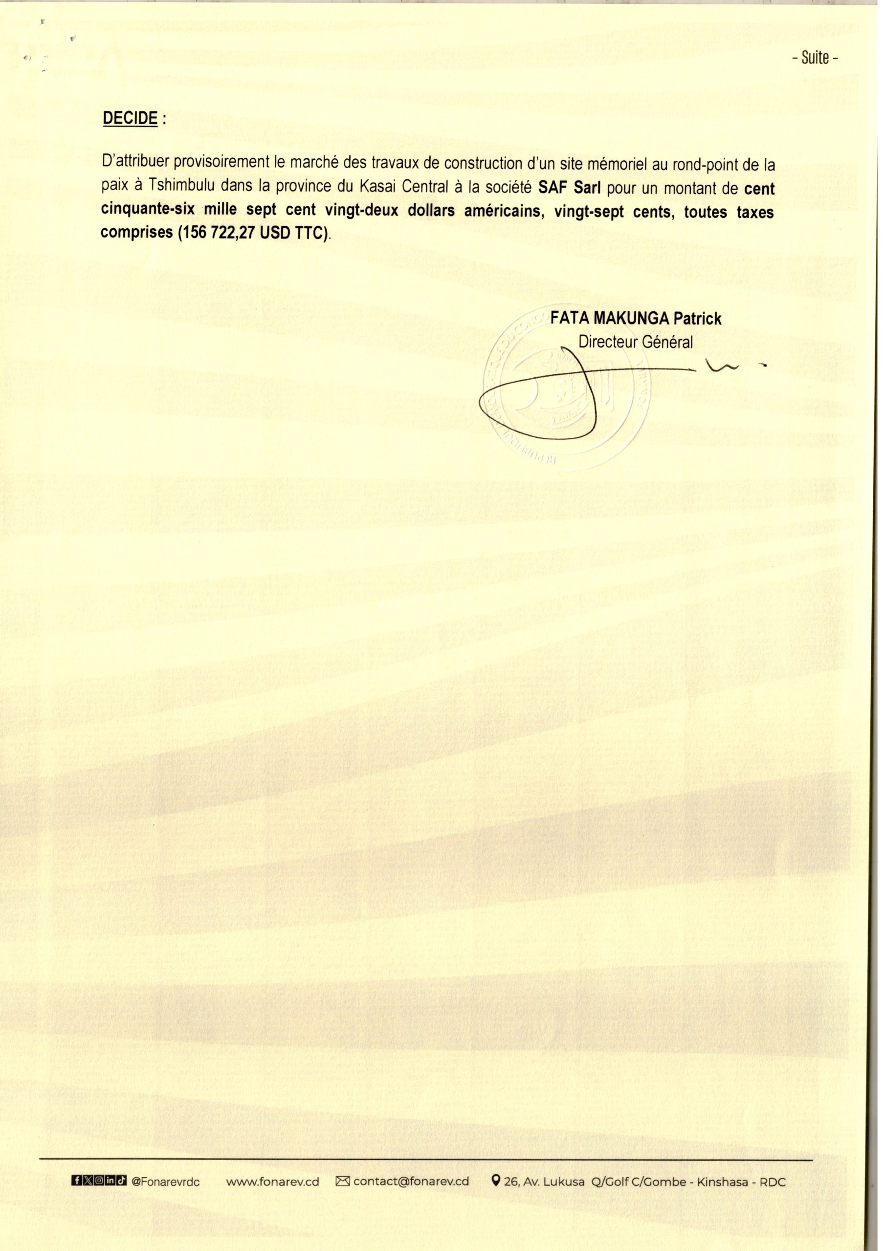 Attribution provisoire accordée à la société SAF Sarl relative aux travaux de construction d’un site mémoriel au rond-point de la paix à Tshimbulu dans la province du Kasaï Central.
