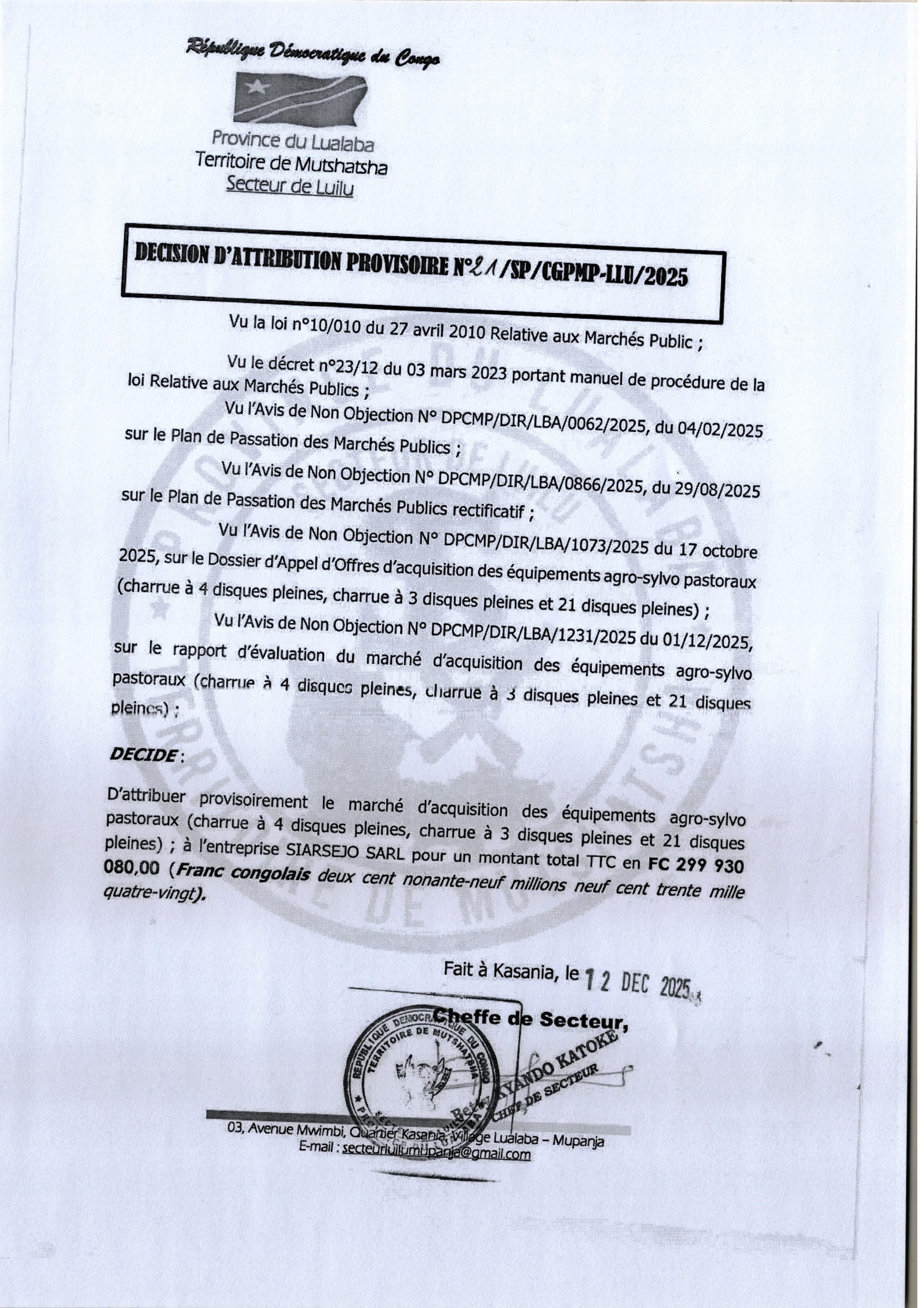 Attribution provisoire accordée à la société “SIARSEJO SARL” relative au marché d’acquisition des équipements agro-sylvo pastoraux (charrue à 4 disques pleines, charrue à 3 disques pleines).