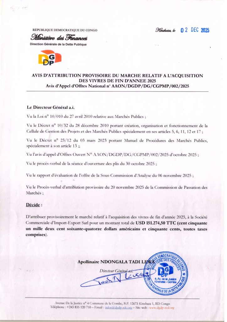 Attribution provisoire accordée à la société “SOCIETE COMMERCIALE D’IMPORT-EXPORT SARL” relative au marché d’acquisition des vivres de fin d’année.