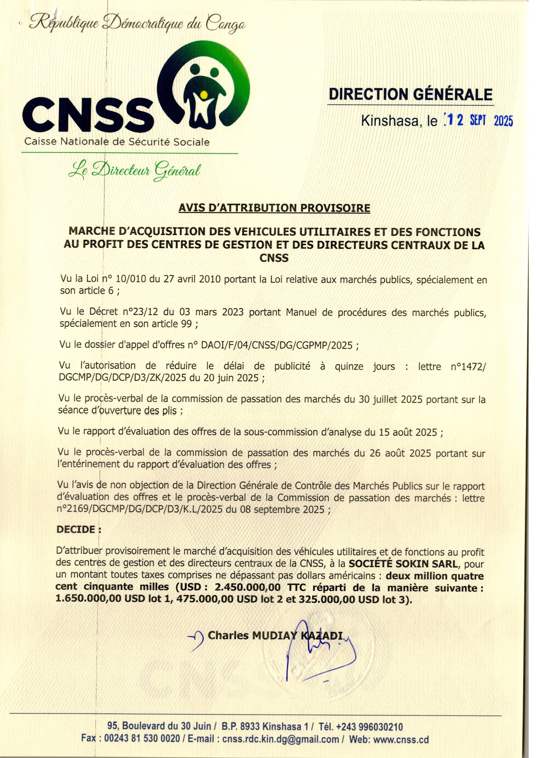 Attribution provisoire accordée à la société SOKIN relative à l’acquisition des Véhicules utilitaires et des fonctions au profit des centres de gestion et des Directeurs Centraux de la CNSS