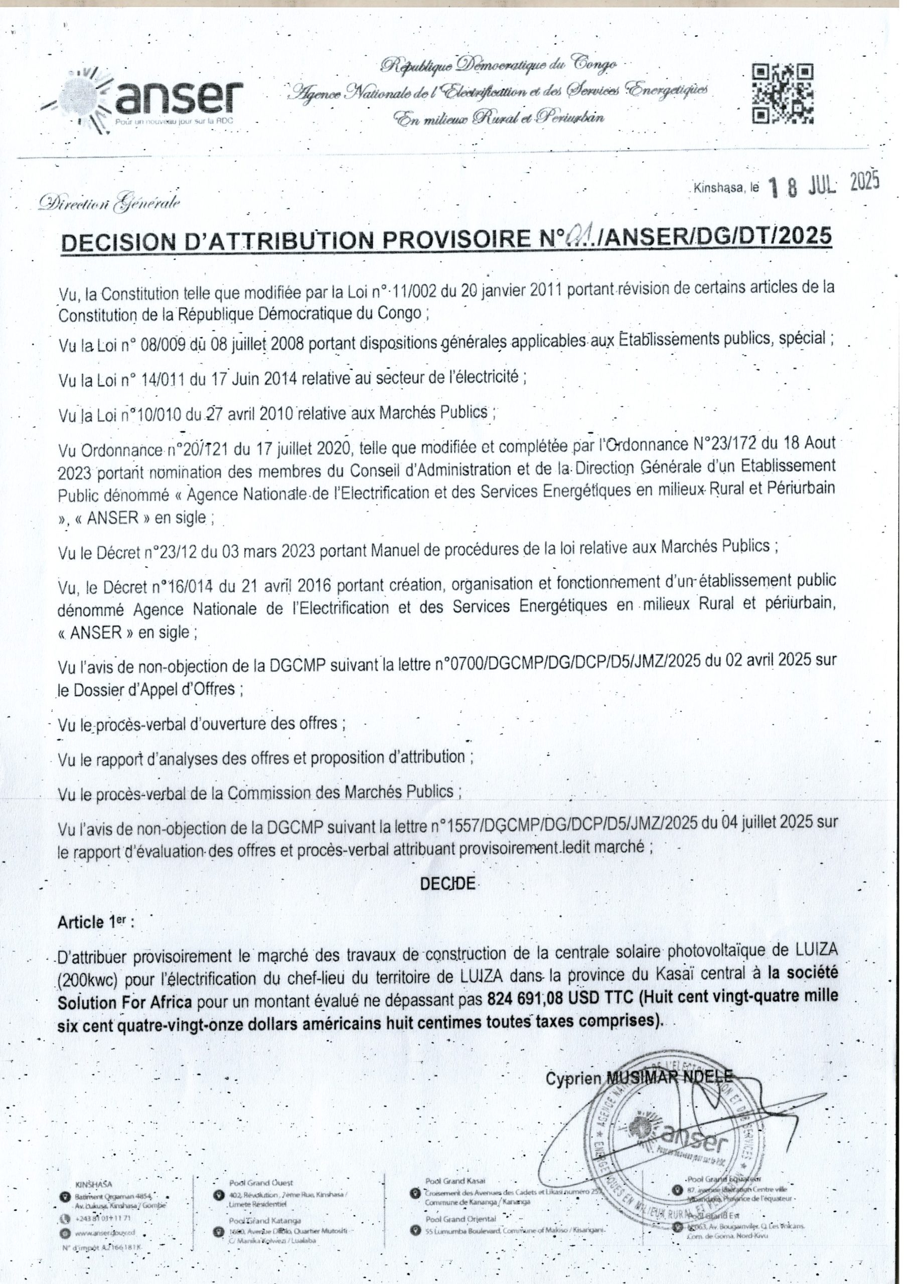 Attribution provisoire accordée à la société “Solution For Africa” le marché relatif aux travaux de construction de la centrale photovoltaique de Luiza (200kwc) pour l’éléctrification du chef-lieu de Luiza dans le Kasai Central.