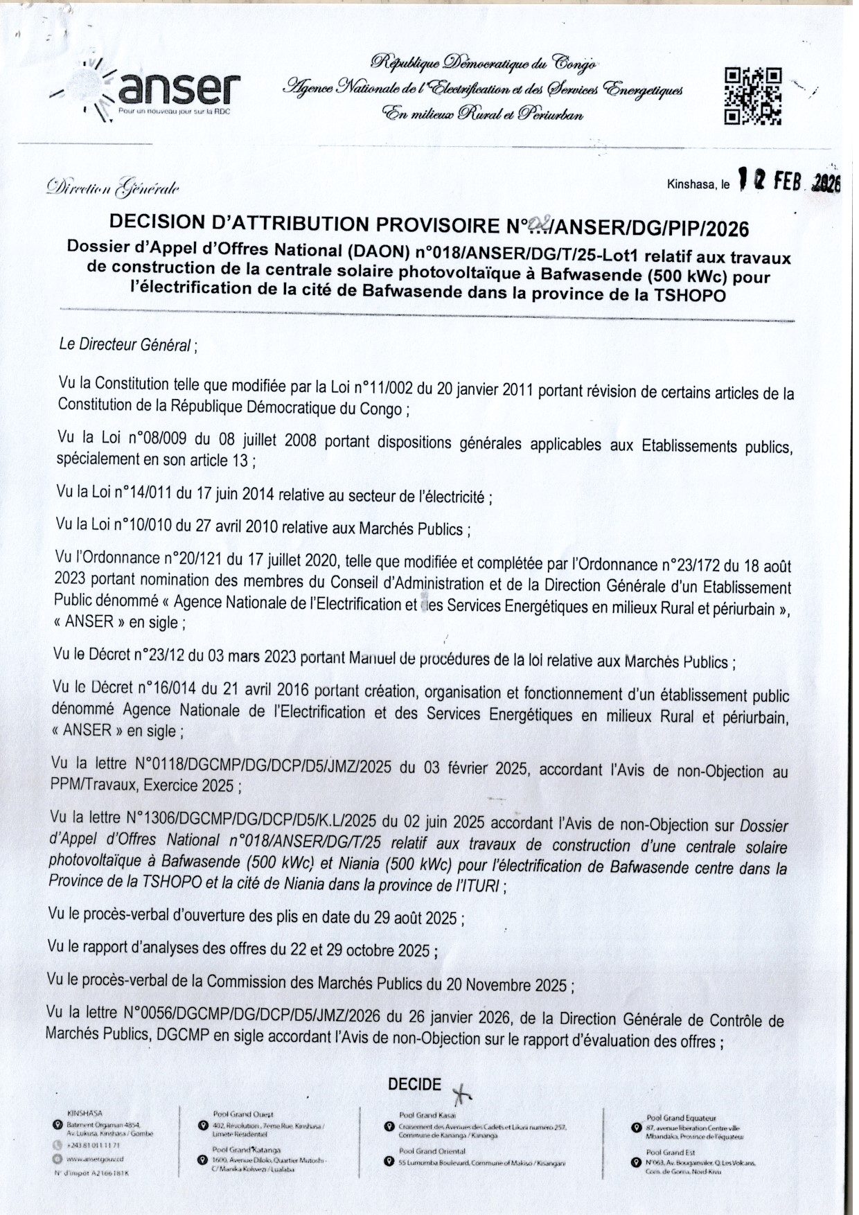 Attribution provisoire accordée à la société SOLUTIONS FOR AFRICA SAS relative aux travaux de construction de la central solaire photovoltaïque à Bafwasende dans la province de la TSHOPO.