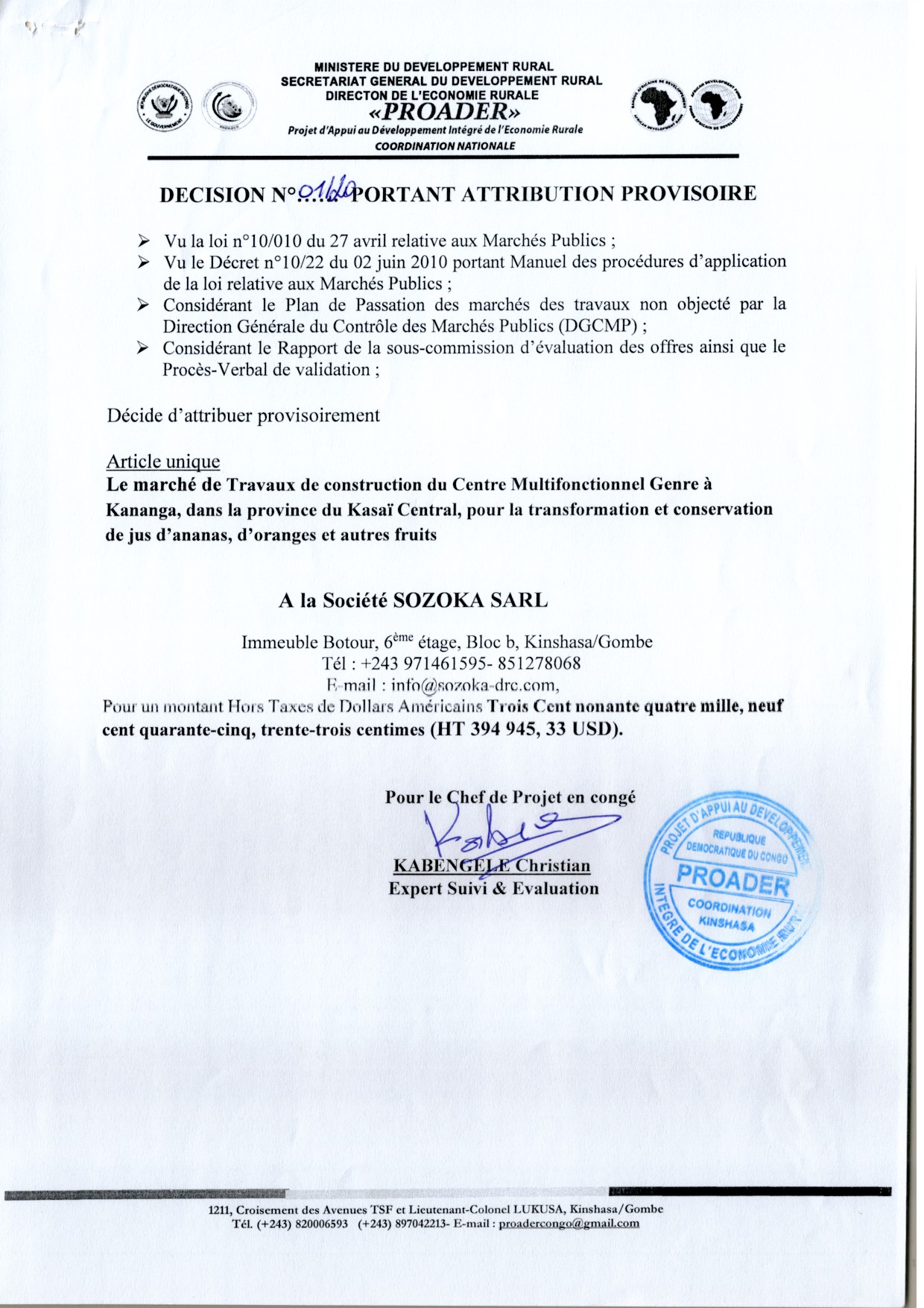 Attribution provisoire accordée à la société SOZOKA relative aux travaux de construction du Centre Multifonctionnel Genre à kananga, dans la province du Kasai Central, pour la transformation et conservation de jus d’ananas, d’oranges et autres fruits.