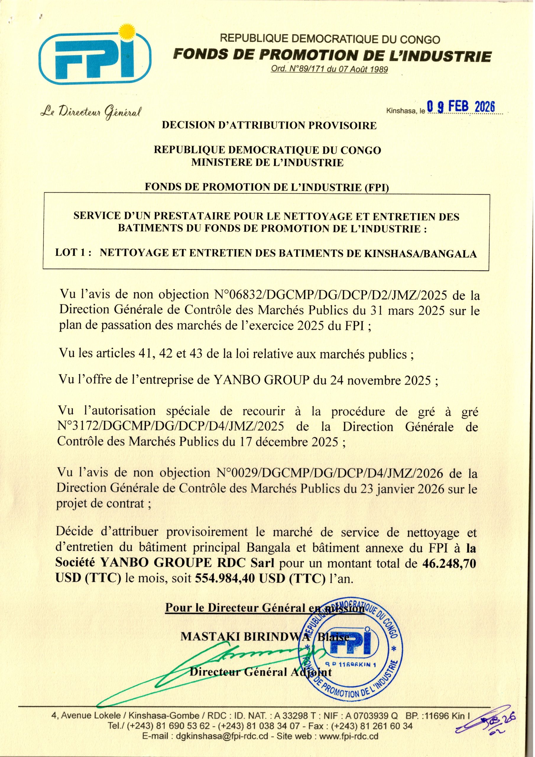 Attribution provisoire accordée à la société YANBO GROUPE RDC Sarl relative au service de nettoyage et d’entretien du bâtiment principal Bangala et bâtiment annexe du FPI.