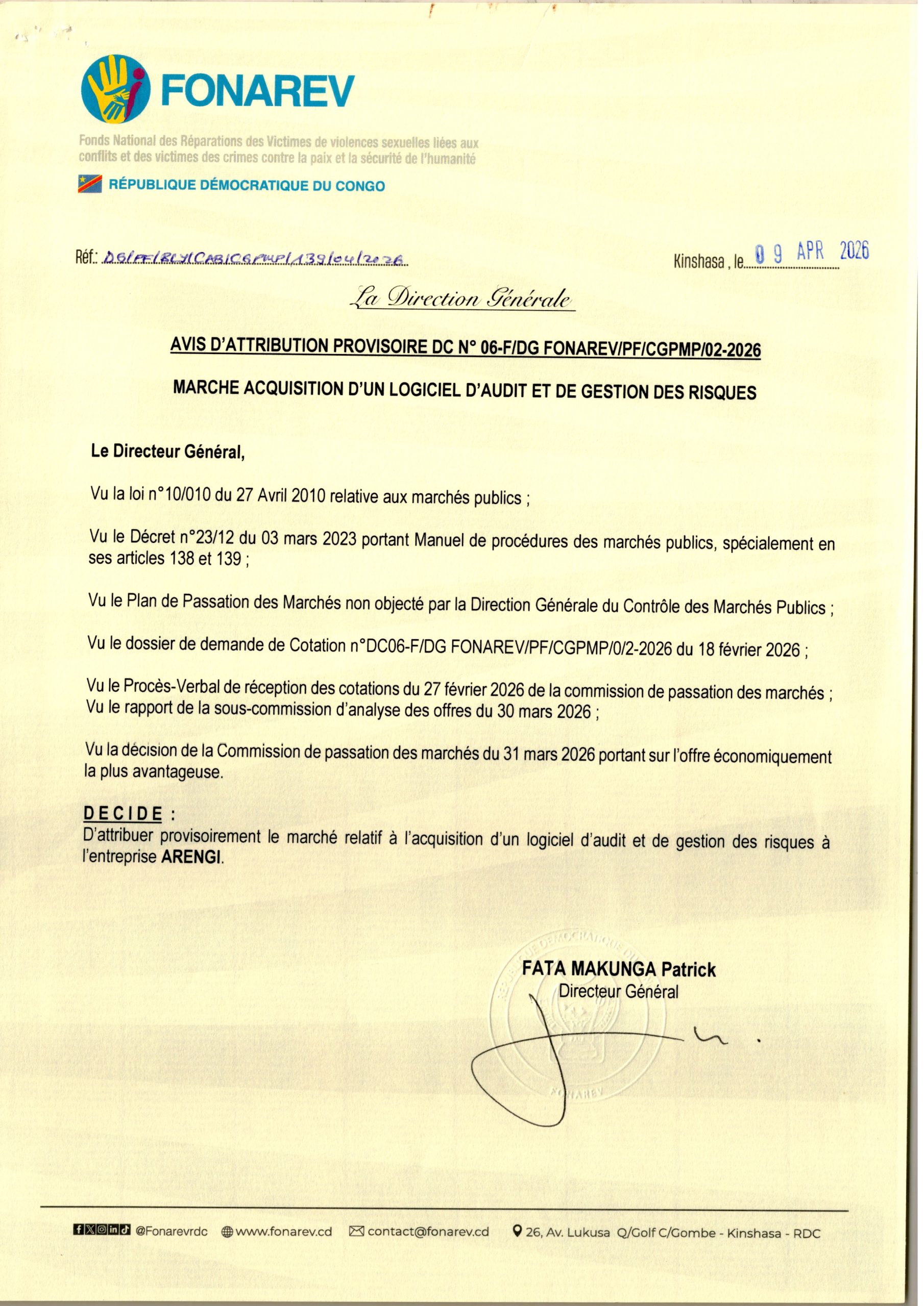 Attribution provisoire accordée à l’Entreprise ARENGI relative à l’acquisition d’un logiciel d’audit et de gestion des risques.