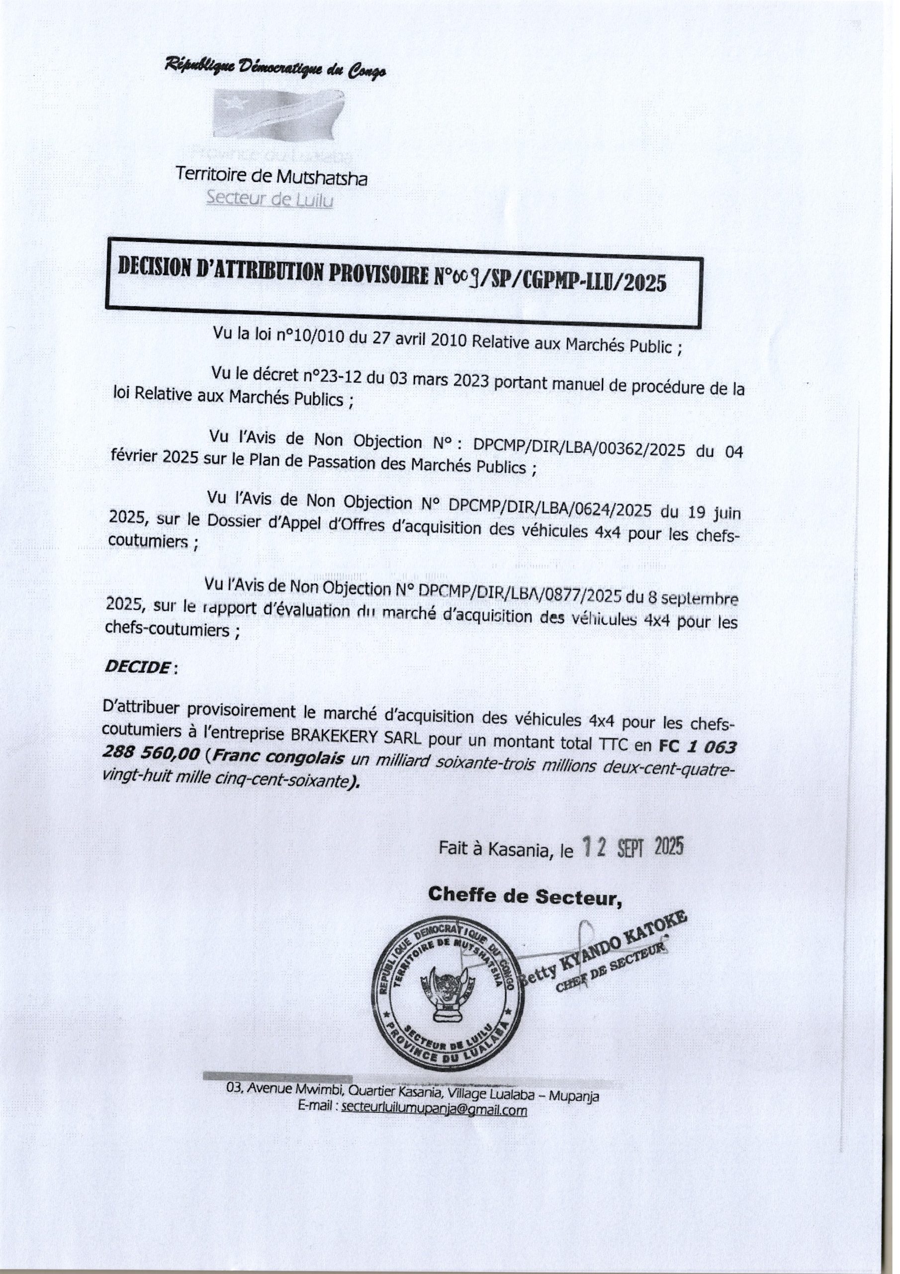 Attribution Provisoire accordée à l’entreprise BRAKEKERY relative à l’acquisition des véhicules 4×4 pour les chefs-coutimiers