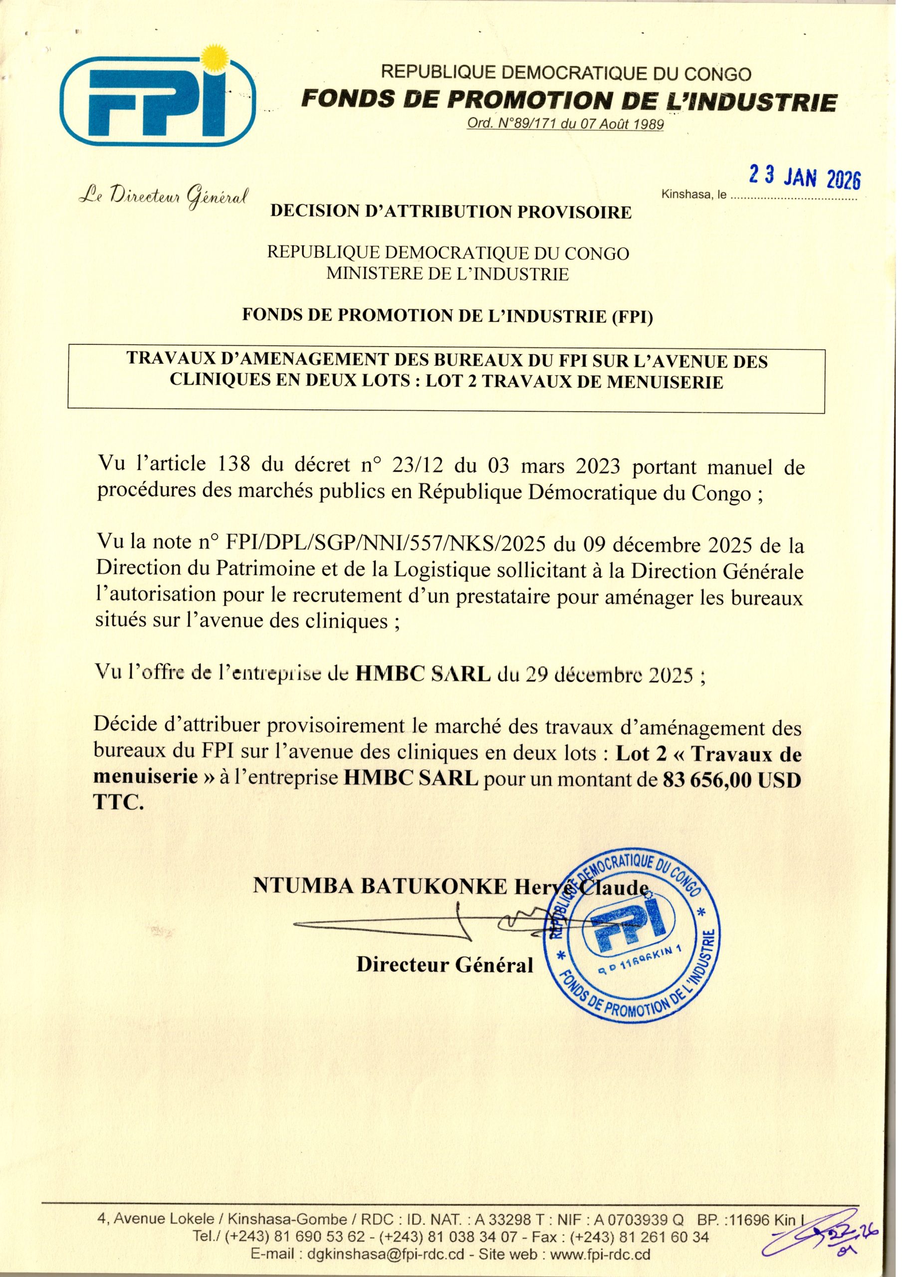 Attribution provisoire accordée à l’Entreprise HMBC SARL relative aux travaux d’aménagement des bureaux du FPI sur l’avenue des cliniques en deux lots: lot 2 Travaux de menuiserie.