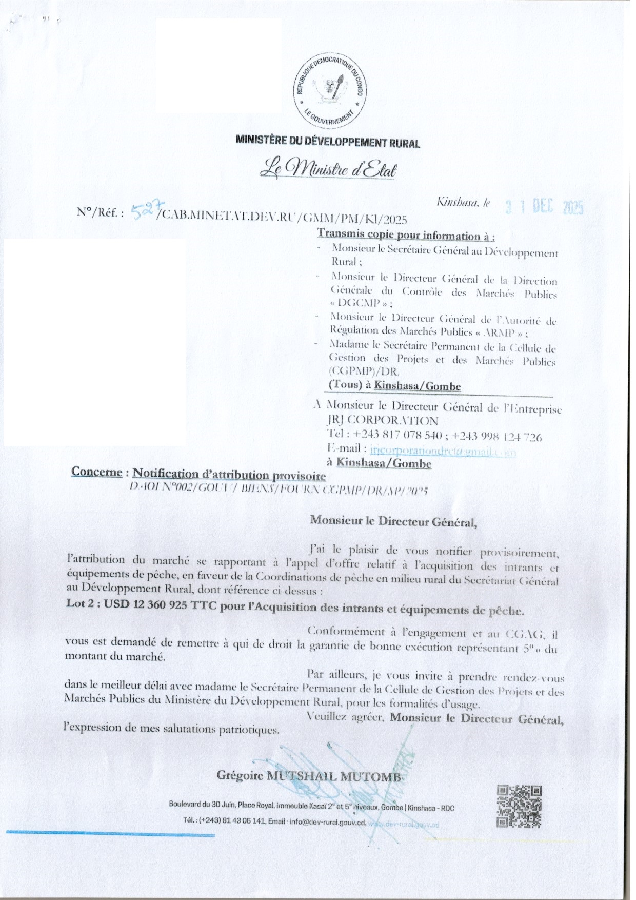 Attribution provisoire accordée à l’entreprise JRJ CORPORATION relative à l’acquisition des intrants et équipements de pêche (lot 2)