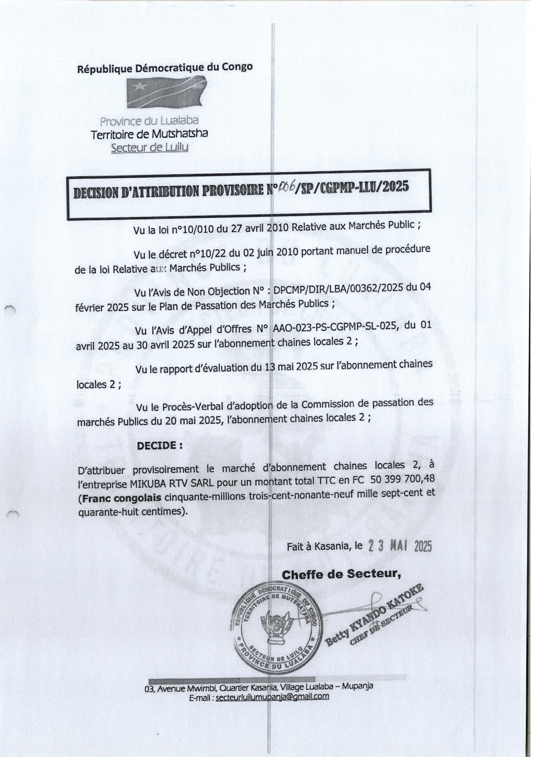Attribution provisoire accordée à l’Entreprise MIKUBA RTV relative à l’abonnement chaines locales 2.