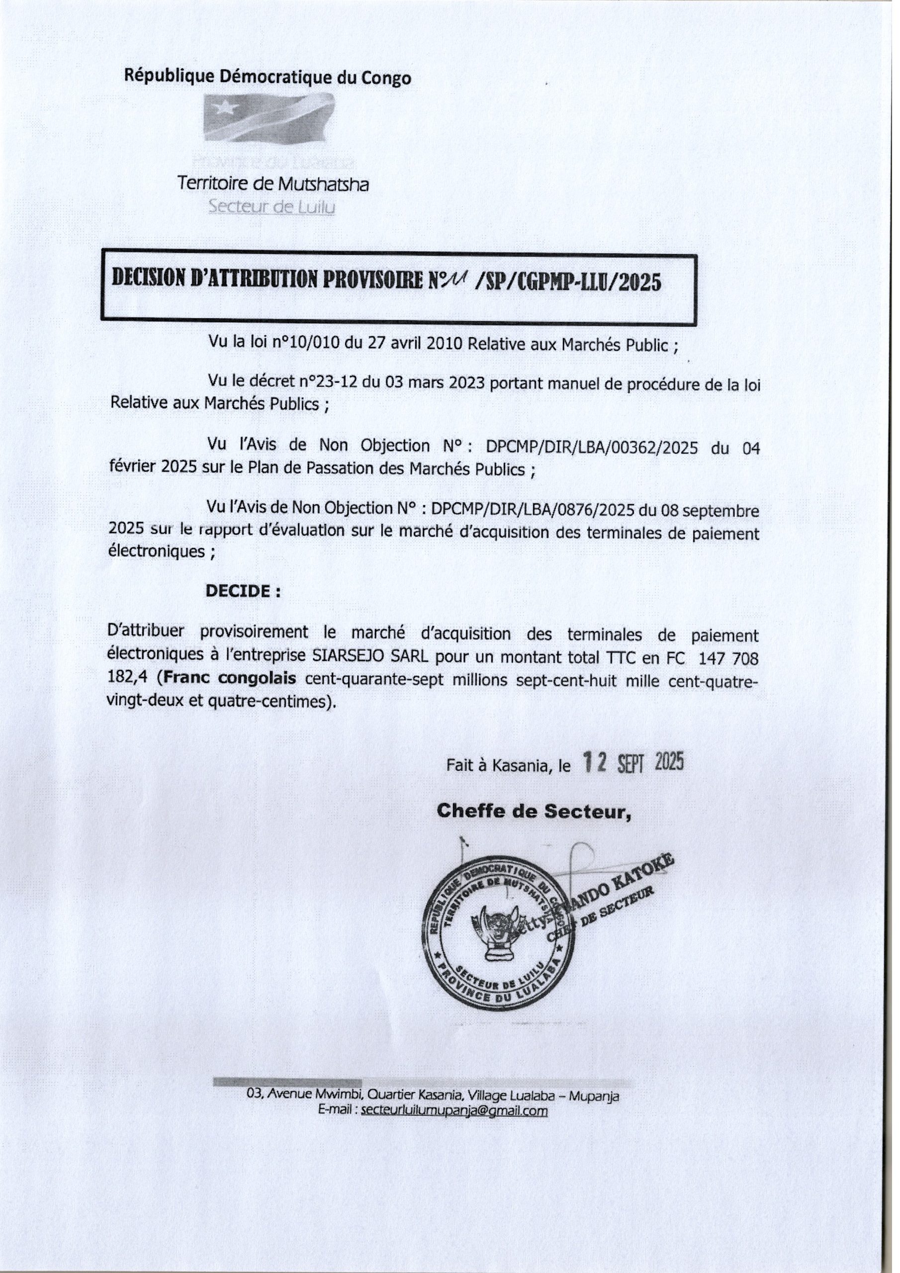Attribution provisoire accordée à l’Entreprise SIARSEJO SARL relative à l’acquisition des terminales de paiement électroniques.
