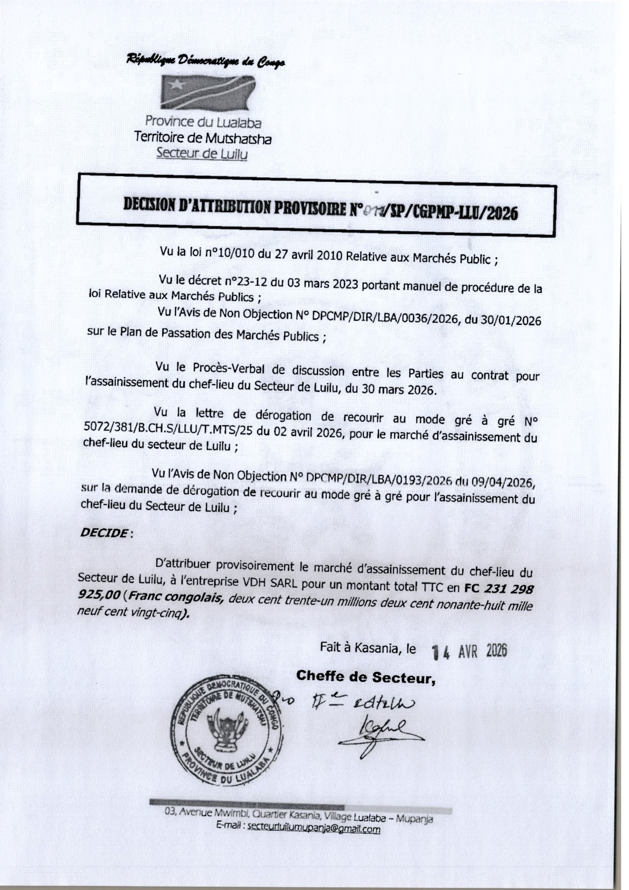 Attribution provisoire accordée à l’entreprise VDH relative au marché d’assainissement du chef-lieu du secteur de Luilu