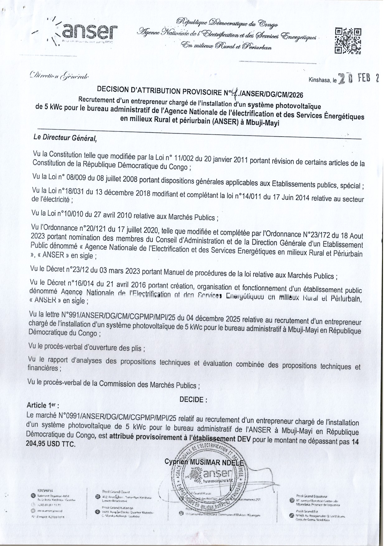 Attribution provisoire accordée à l’Etablissement DEV relative au recrutement d’un entrepreneur chargé de l’installation d’un système photovoltaïque de 5 kWc pour le bureau administratif de l’ANSER à Mbuji-Mayi.