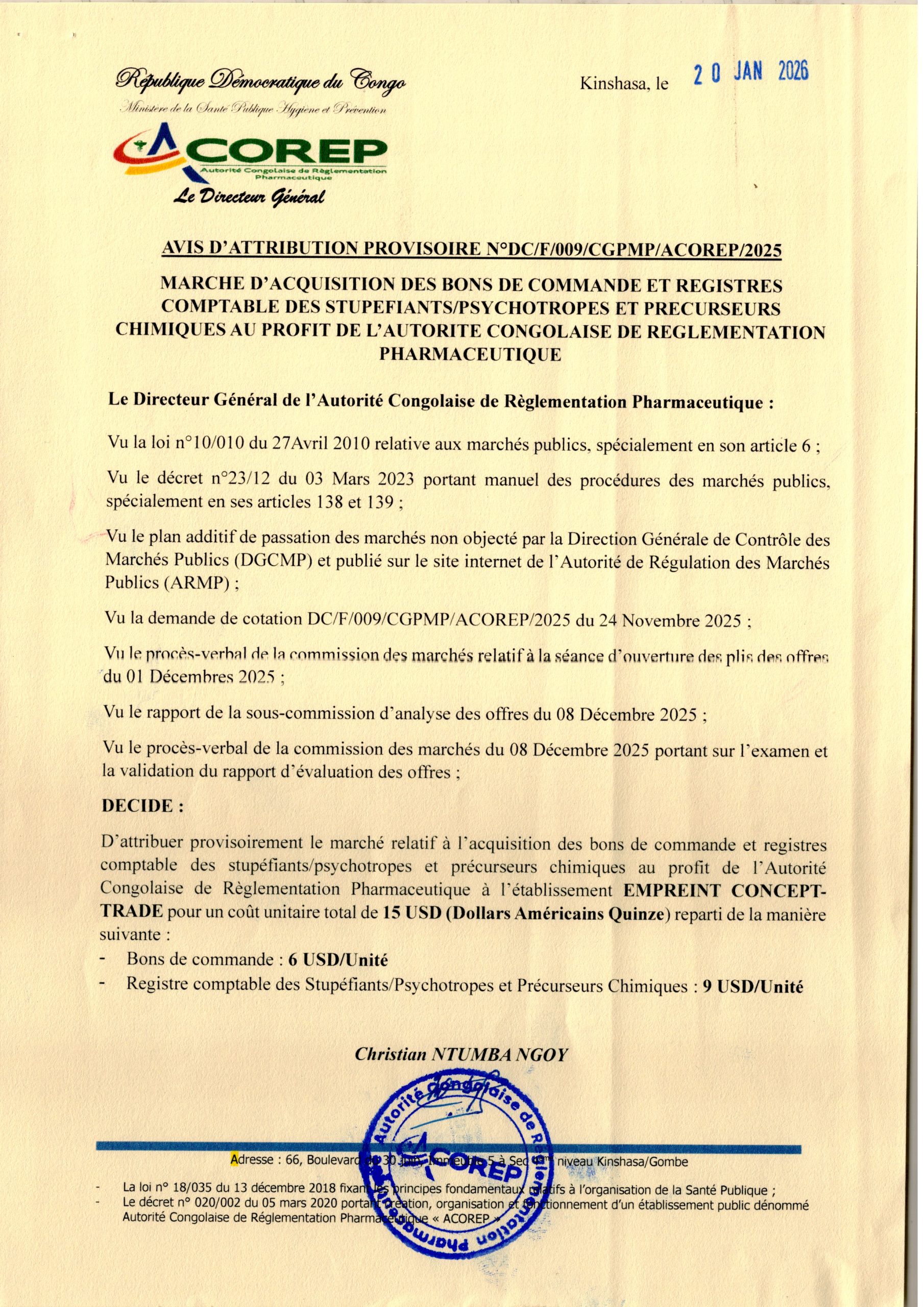 Attribution provisoire accordée à l’Etablissement EMPRENT CONCEPTTRADE relative à l’acquisition des bons de commande et registres comptables des stupéfiants psychotropes et précurseurs chimiques au profit de l’ACOREP.
