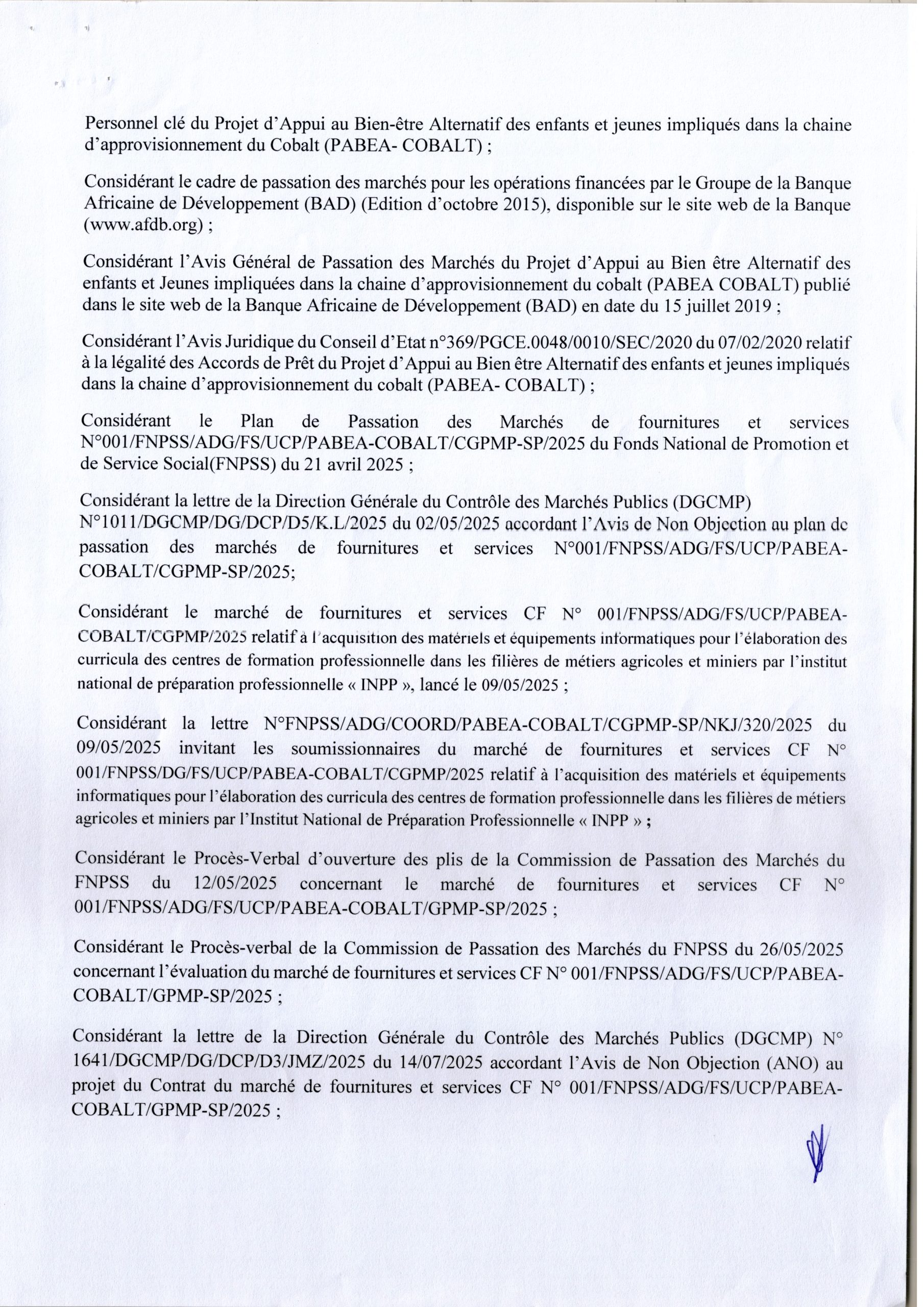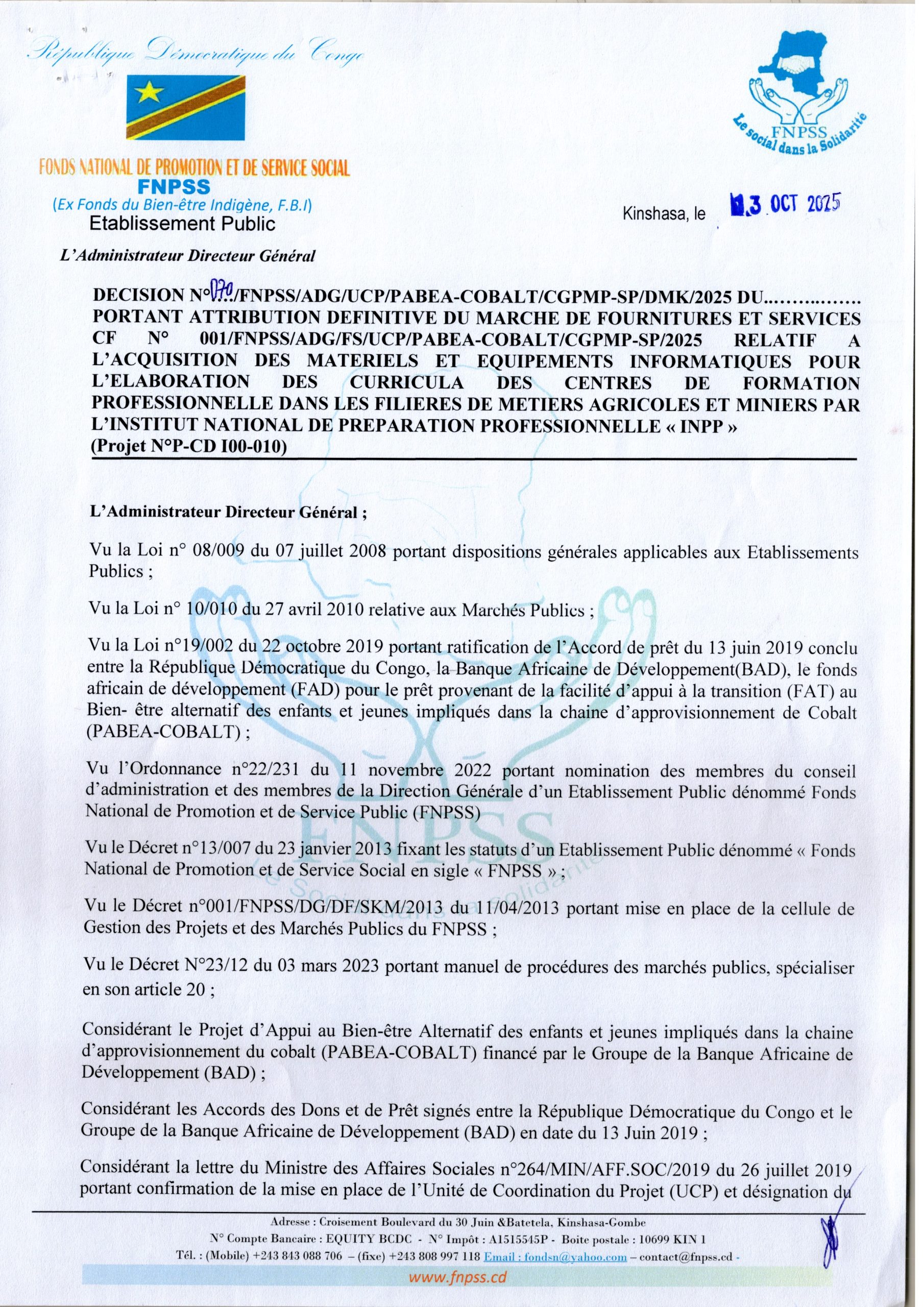 Attribution provisoire accordée à l’ETABLISSEMENT NEW LE JOURDAIN relative à l’acquisition des matériels et équipements informatiques pour l’élaboration des curricula des centres de formation professionnelle dans les filières de métiers agricoles et miniers par l’INPP.