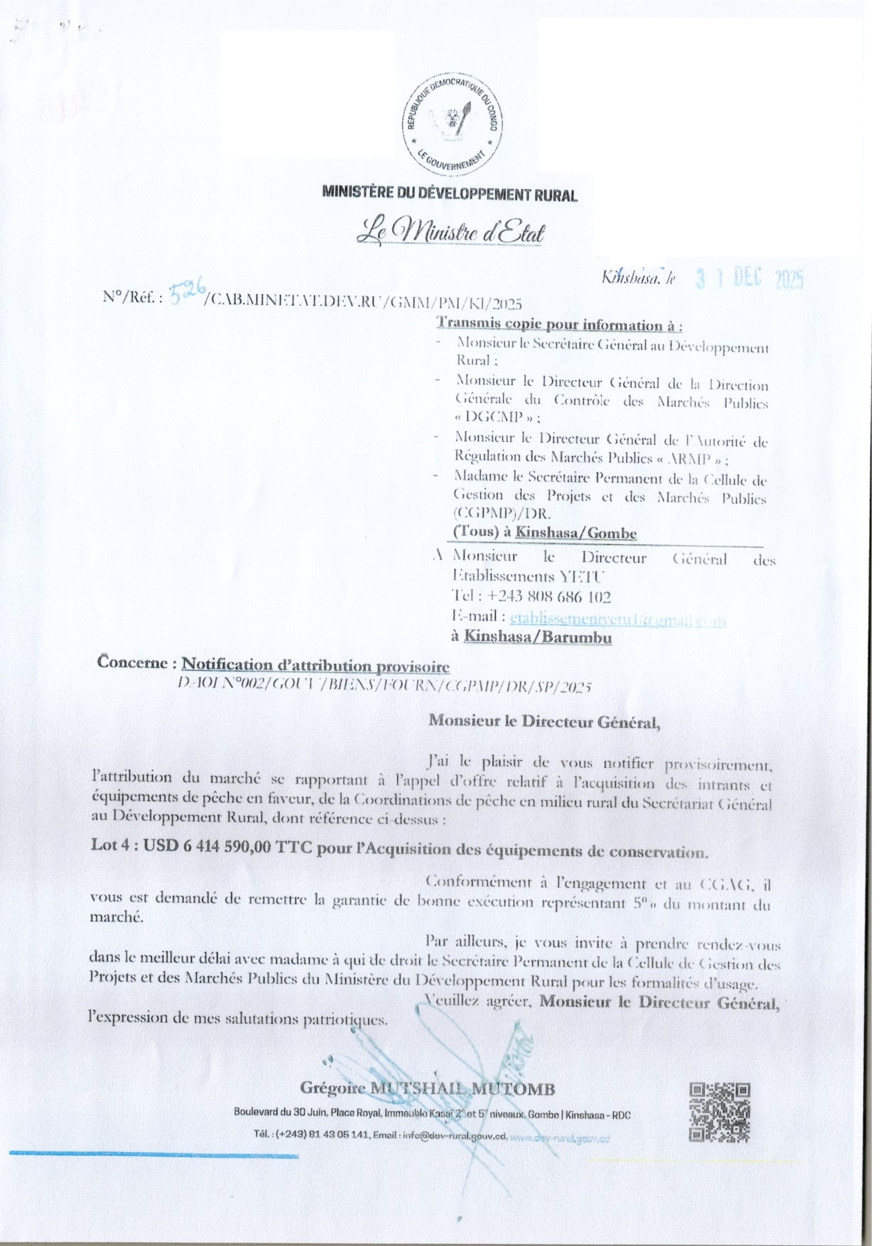 Attribution provisoire accordée à l’Établissement YETU relative à l’acquisition des équipements de conservation (lot 4)