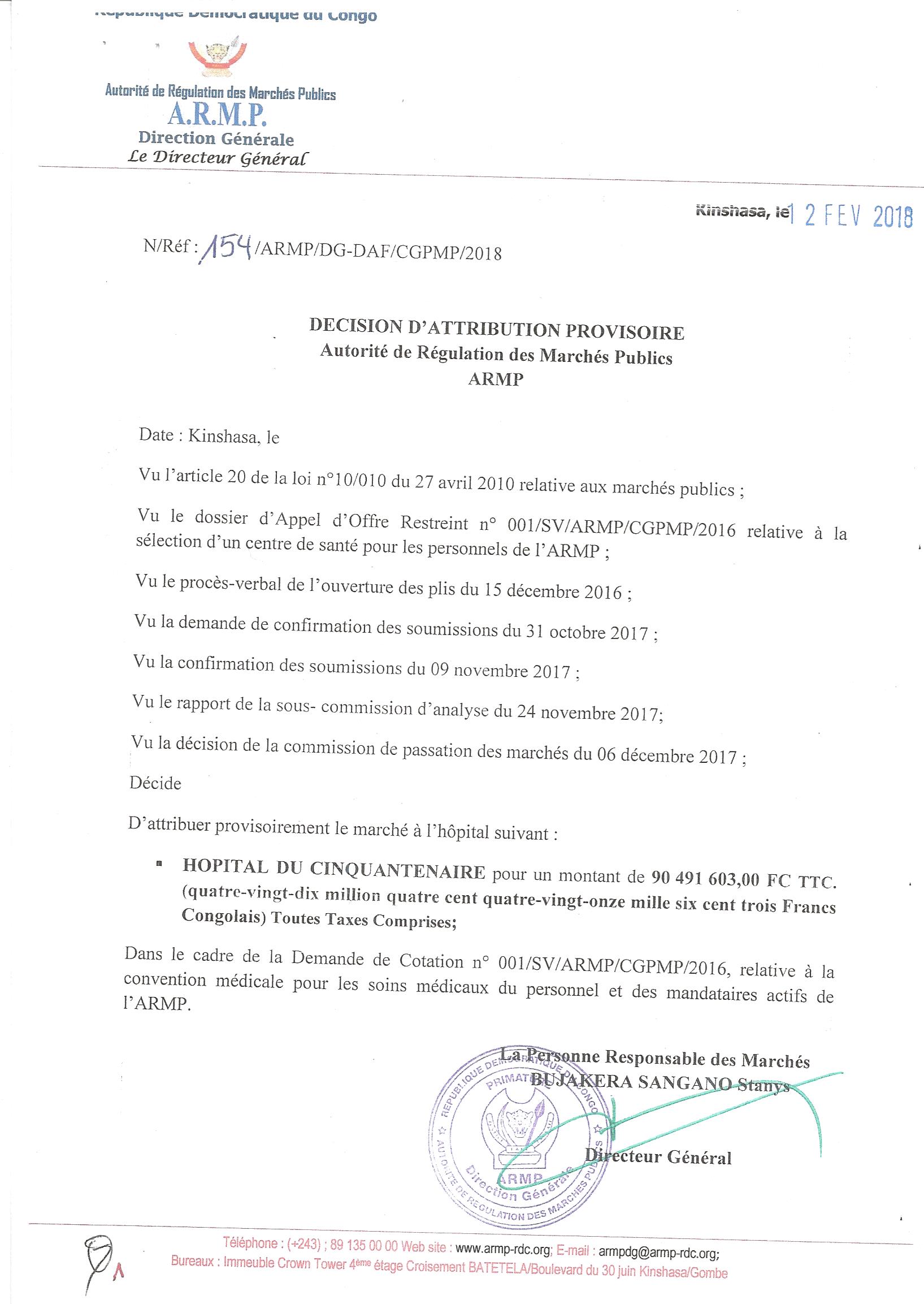 Attribution provisoire accordée à l’hopital du cinquantenaire relative à la convention médicale pour les soins médicaux du personnel et des mandataires actifs de l’armp.