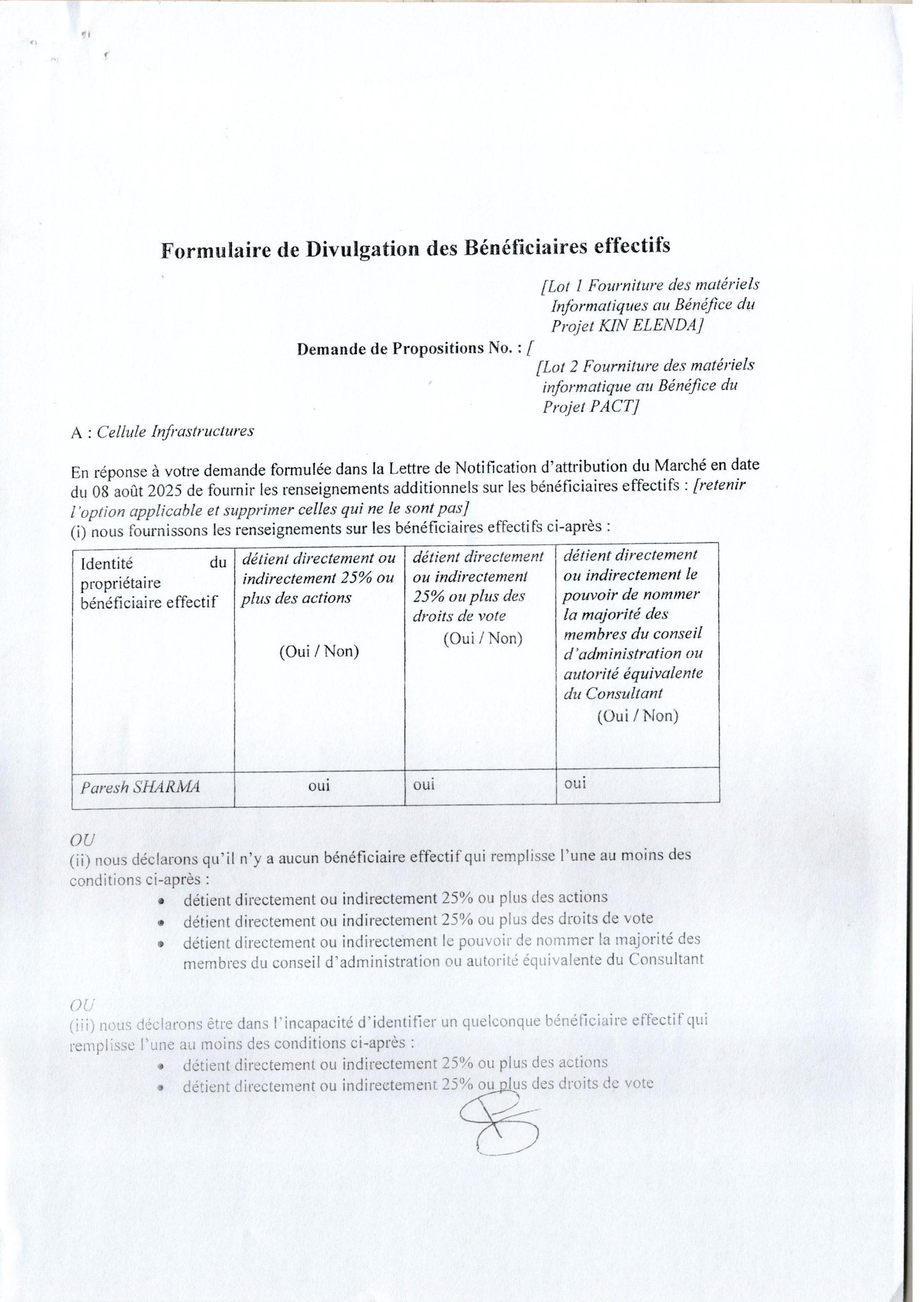 Attribution provisoire accordée à LNK AFRICA relative au fourniture des matériels informatiques au bénéfice du personnel du Projet KIN-ELENDA (Lot 1) et fourniture des au fourniture des matériels informatiques au bénéfice du personnel du Projet PACT (Lot 2)