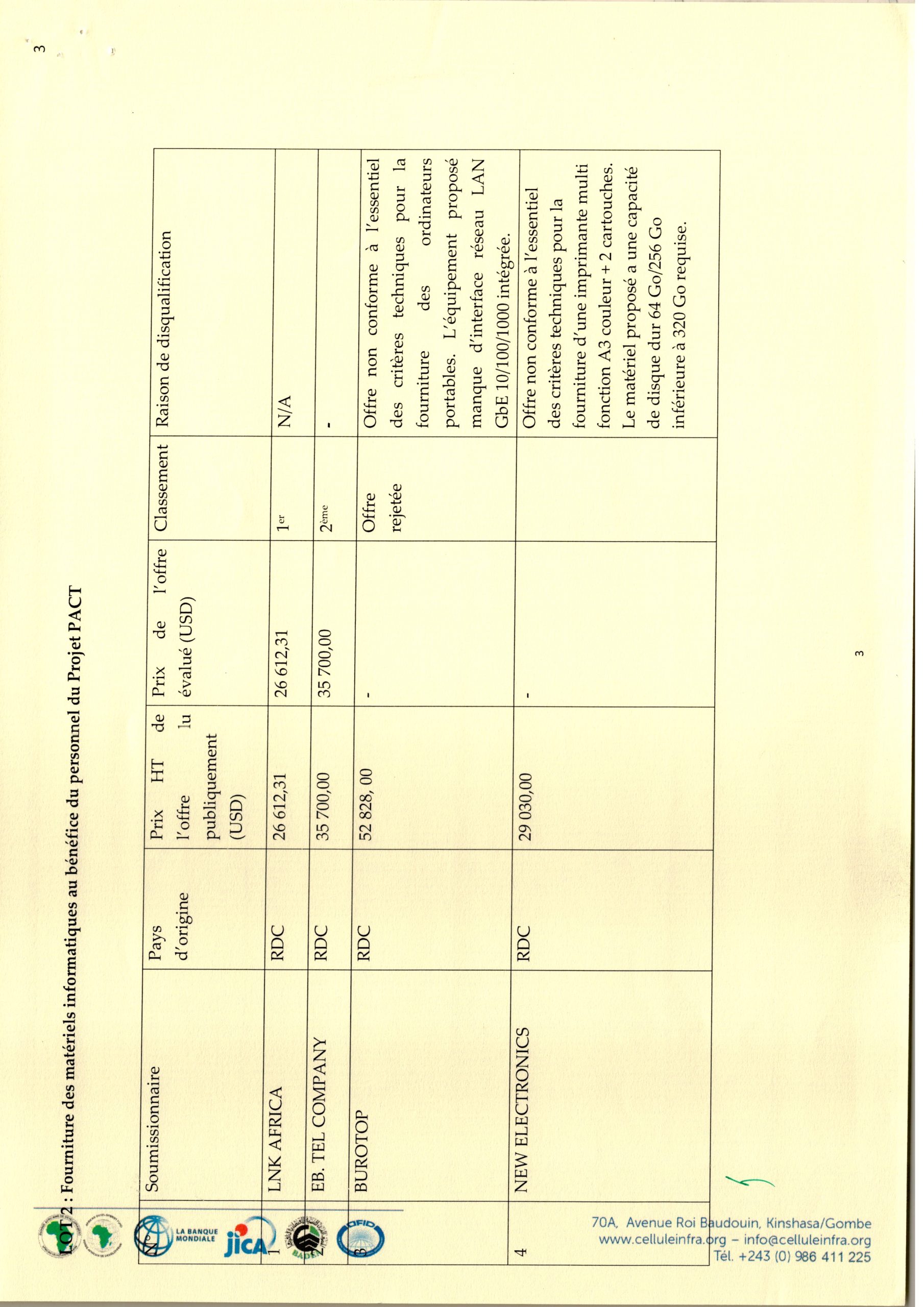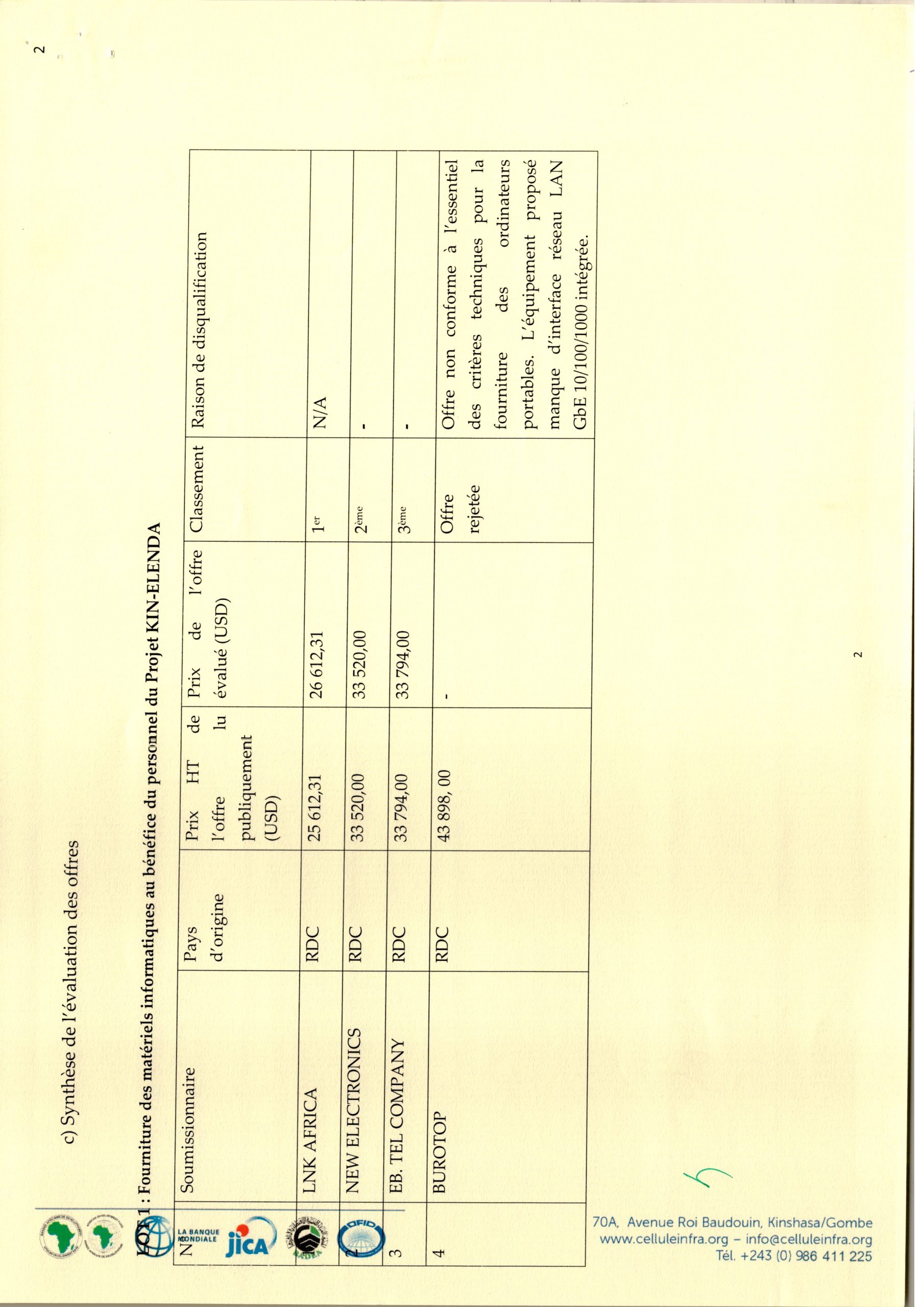 Attribution provisoire accordée à LNK AFRICA relative au fourniture des matériels informatiques au bénéfice du personnel du Projet KIN-ELENDA (Lot 1) et fourniture des au fourniture des matériels informatiques au bénéfice du personnel du Projet PACT (Lot 2)