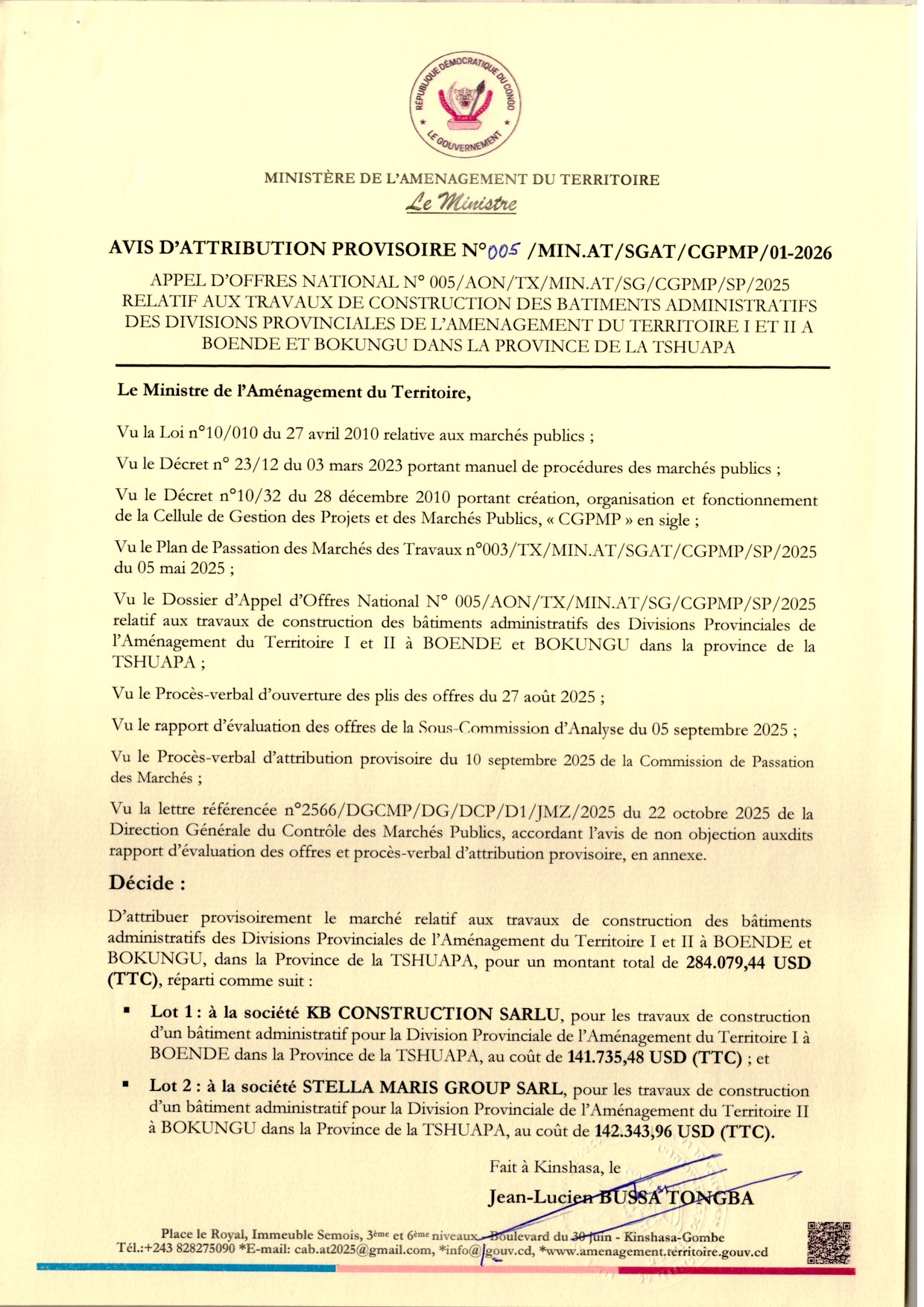 Attribution provisoire accordée à : Lot 1: à la société BK CONSTRUCTION SARLU et Lot 2 : à la société STELLA MARIS GROUP relative travaux de construction des bâtiments administratifs des Divisions Provinciales de Aménagement du Territoire I et II à BOENDE et BOKUNGU, dans la Province de la TSHUAPA.