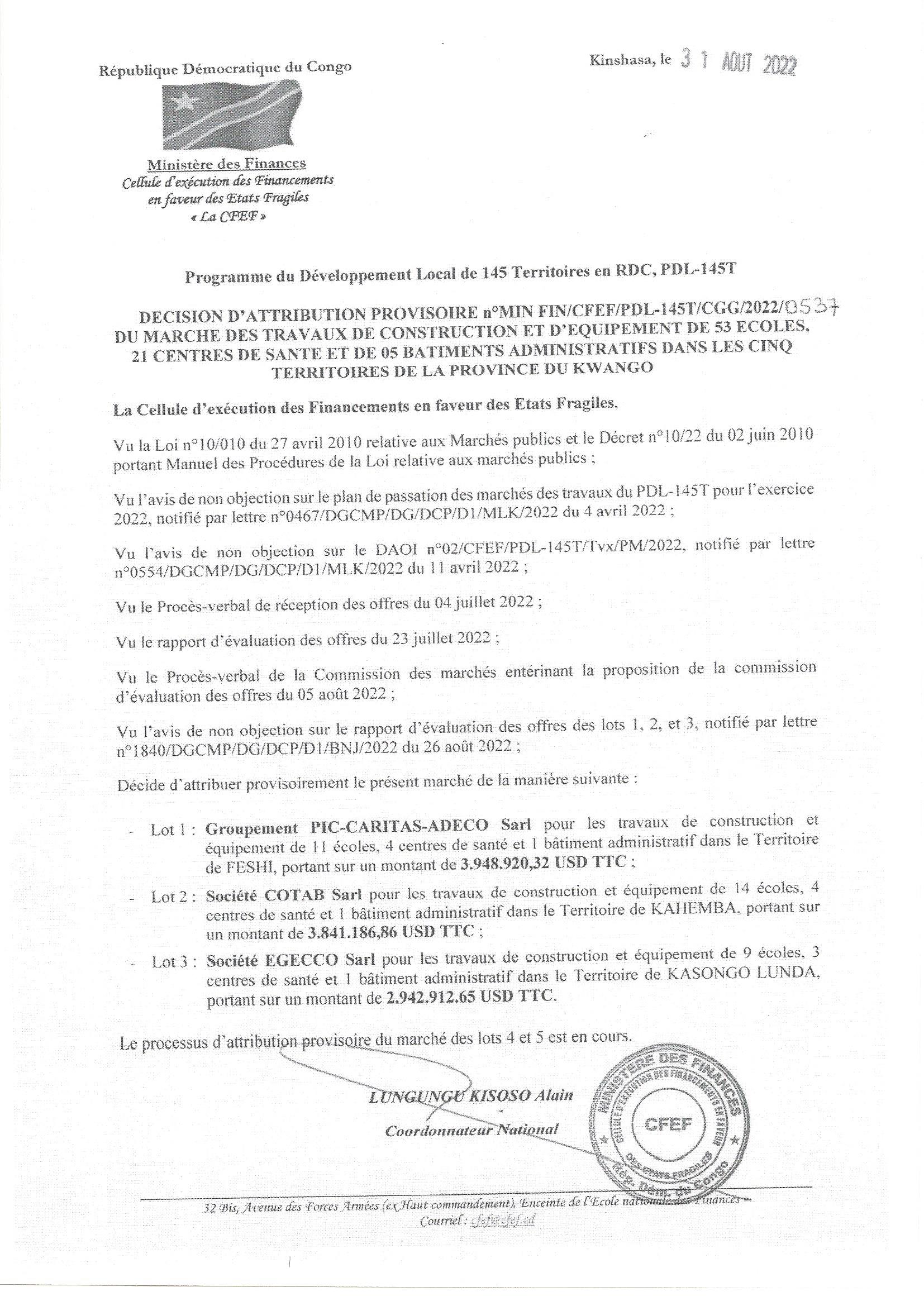 ATTRIBUTION PROVISOIRE ACCORDEE A : LOT 1 GROUPEMENT PIC-CARITAS-ADECO; LOT 2 SOCIETE COTAB ET LOT3 SOCIETE EGECCO RELATIVE AUX TRAVAUX DE CONSTRUCTION ET D’EQUIPEMENT DE 53 ECOLES, 21 CENTRES DE SANTE ET DE 05 BATIMENTS ADMINISTRATIFS DANS LES CINQ ….