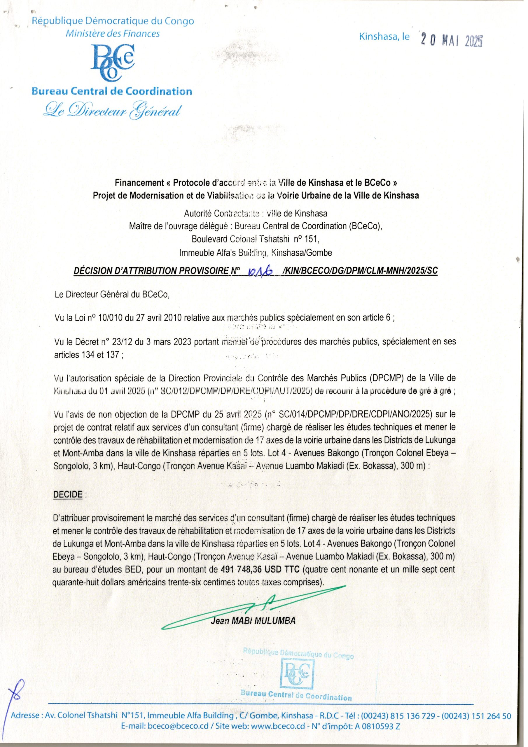 Attribution provisoire accordée au bureau d’études BED relative au services d’un consultant (firme) chargé de réaliser les études techniques et mener le contrôle des travaux de réhabilitation et modernisation de 17 axes de la voirie urbaine….
