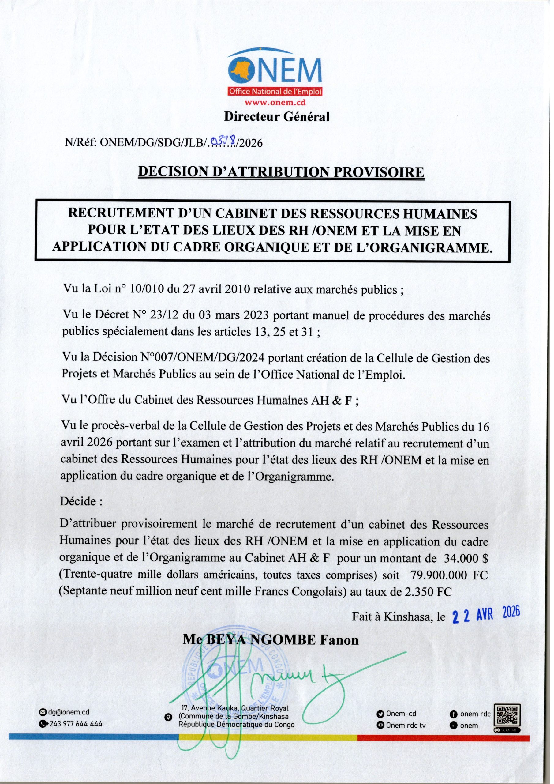 Attribution provisoire accordée au Cabinet AH & F relative au recrutement d’un cabinet des ressources humaines pour l’état des lieux des RH /ONEM et la mise en application du cadre organique et de l’organigramme.