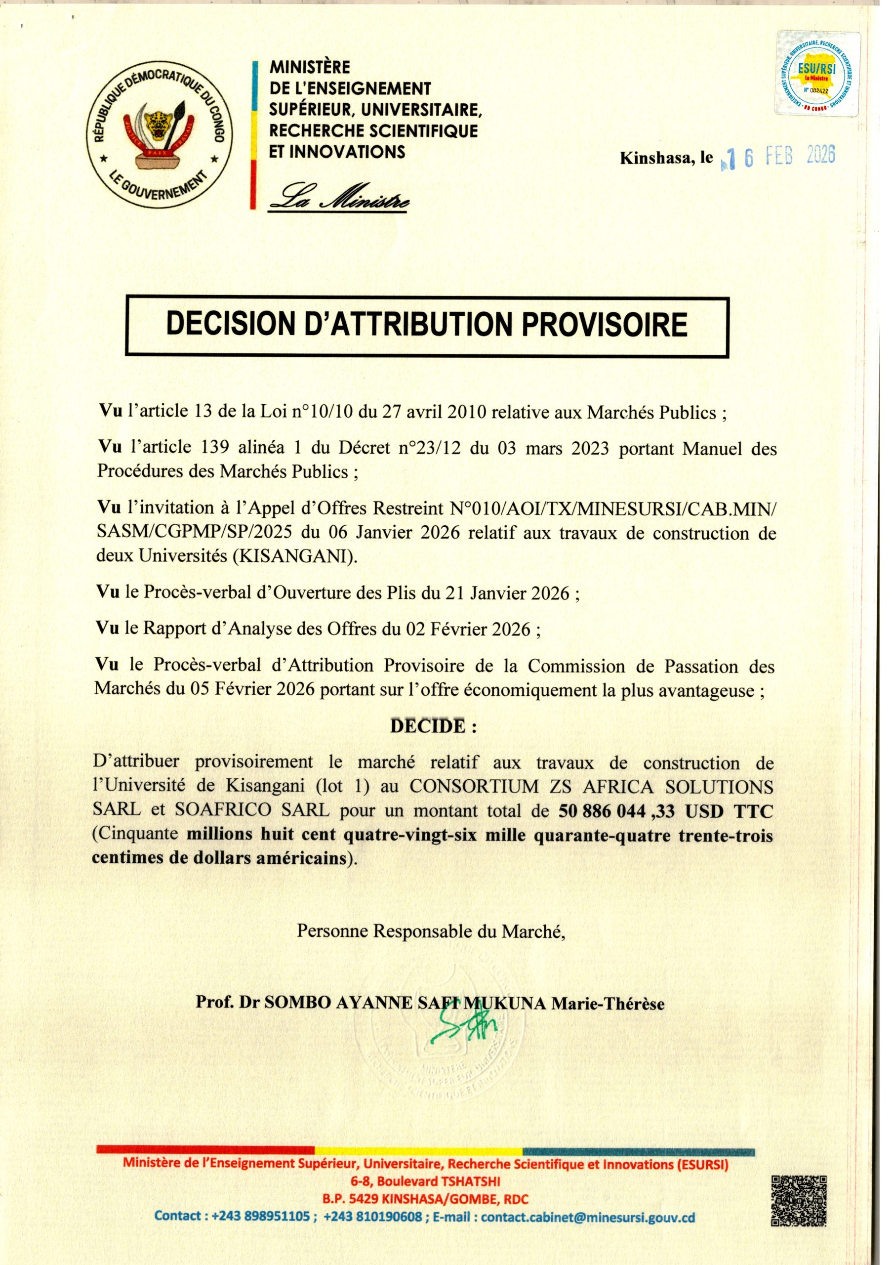 Attribution provisoire accordée au consortium “ZS AFRICA SOLUTIONS SARL ET SOAFRICO SARL” le marché relatif à la construction de l’université de Kisangani (lot1).