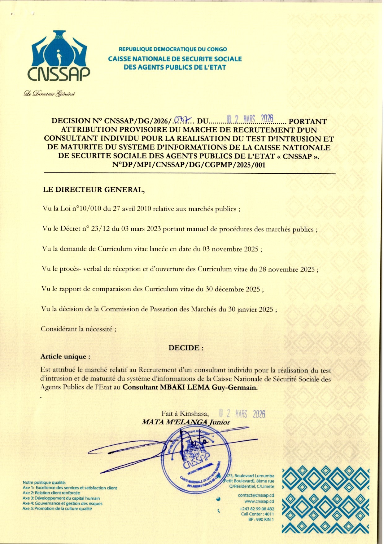 Attribution provisoire accordée au Consultant MBAKI LEMA Guy-Germain relative au recrutement d’un consultant individu pour la réalisation du test d’intrusion et de maturité du système d’information de la Caisse Nationale de Sécurité des Agents Publics de l’Etat.