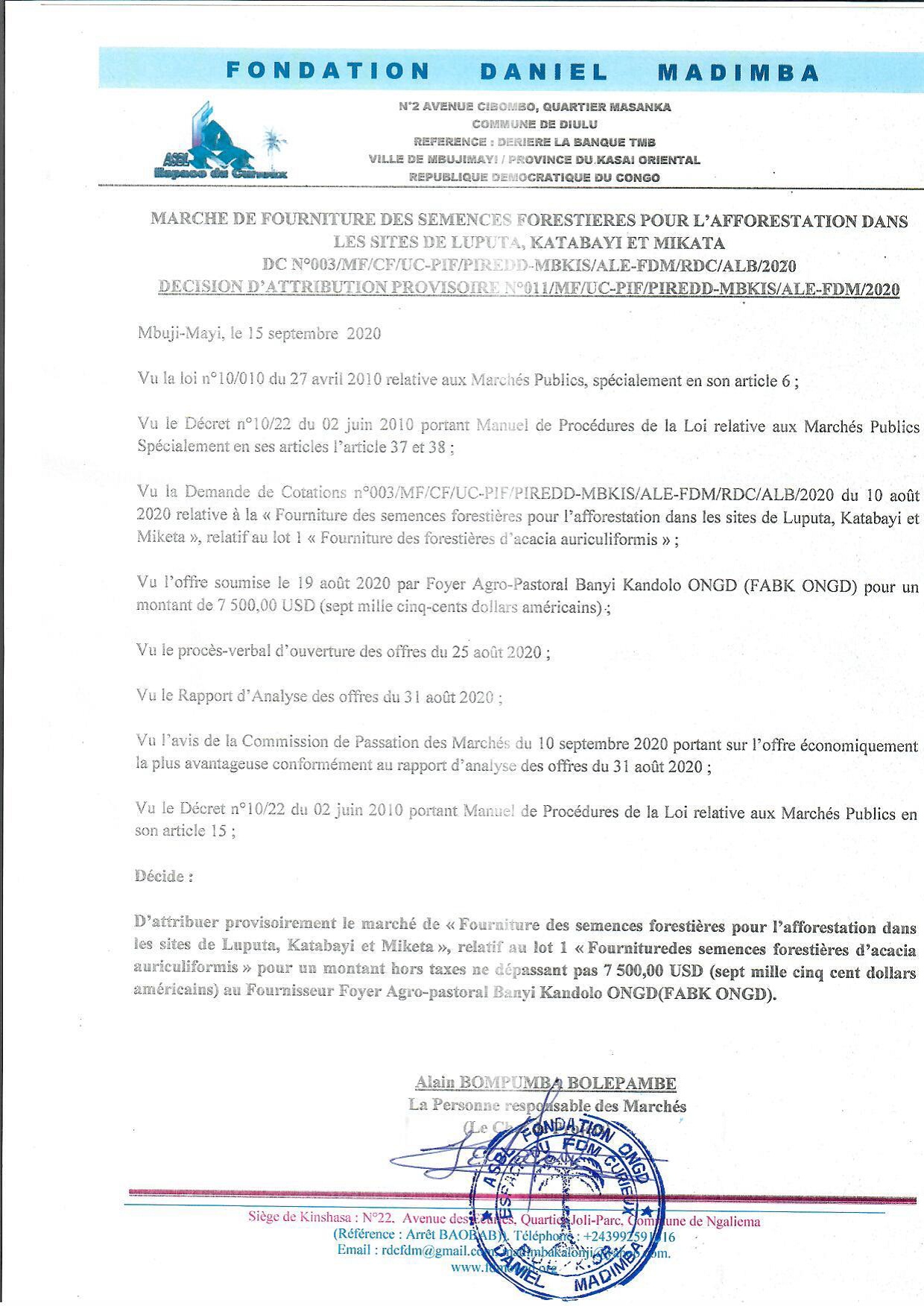 Attribution provisoire accordée au fournisseur fabk ongd relative au marché de fourniture des semences forestières pour l’afforestation dans les sites de luputa, katabayi et miketa, lot 1 acquisition des forestières d’accasia auriculiformis