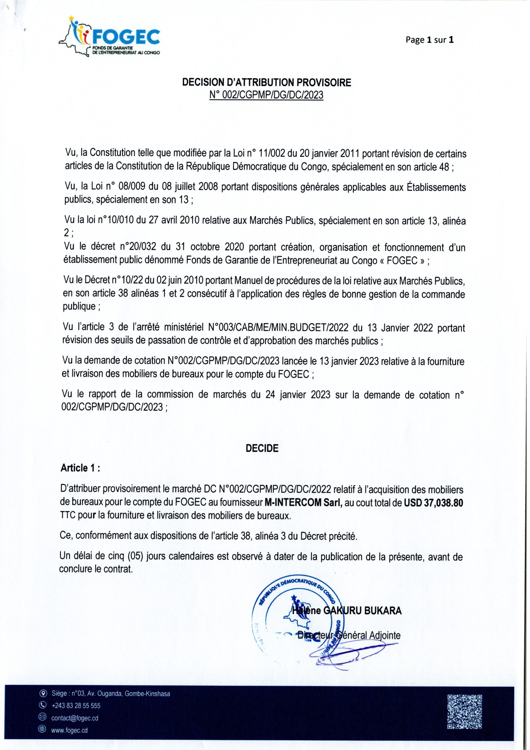 Attribution provisoire accordée au fournisseur M-INTERCOM Sarl relative à l’ acquisition des mobiliers de bureaux pour le compte du FOGEC.