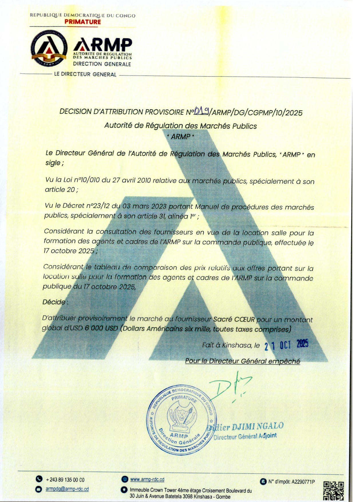 Attribution provisoire accordée au fournisseur SACRE COEUR relative à la formation des agents et cadres de l’ARMP sur la commande publique.