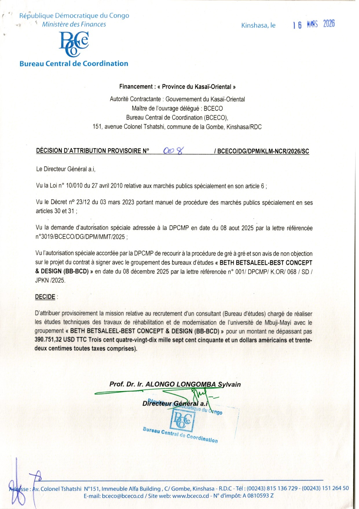 Attribution provisoire accordée au Groupement BETH BETSALEEL-BEST CONCEPT & DESIGN (BB-BCD) relative au recrutement d’un consultant (Bureau d’études) chargé de réaliser les études techniques des travaux de réhabilitation et de modernisation de l’université de Mbuji-Mayi.
