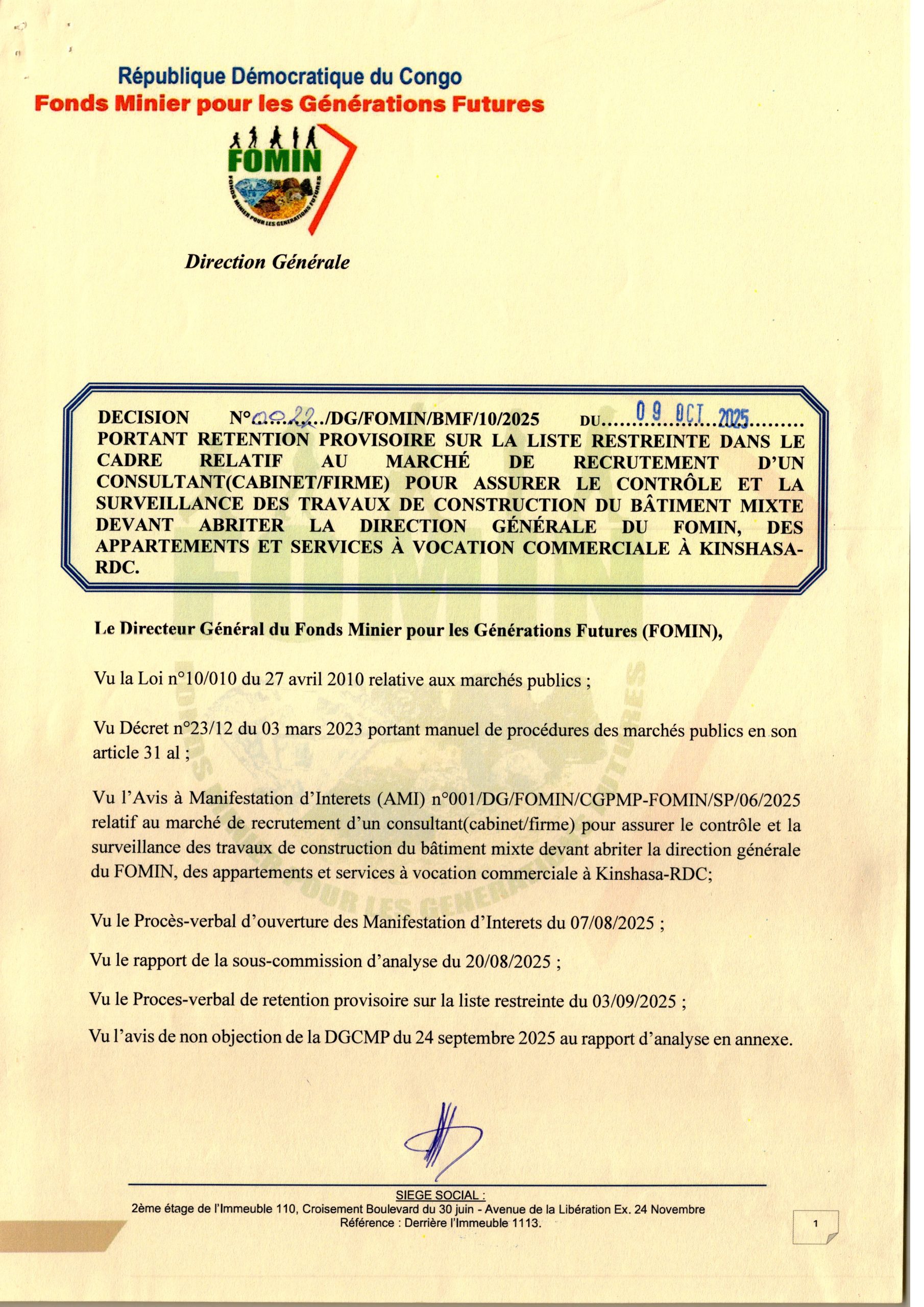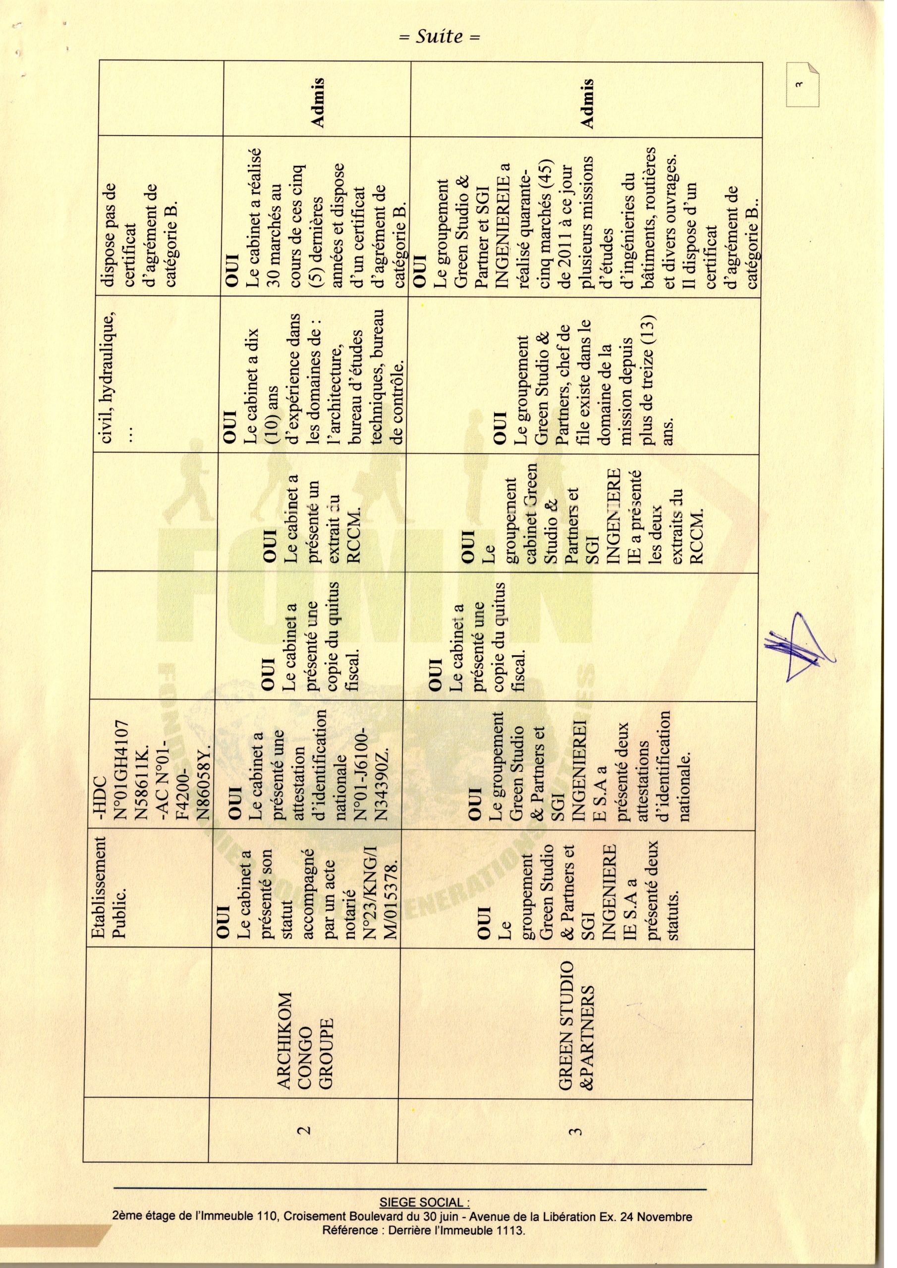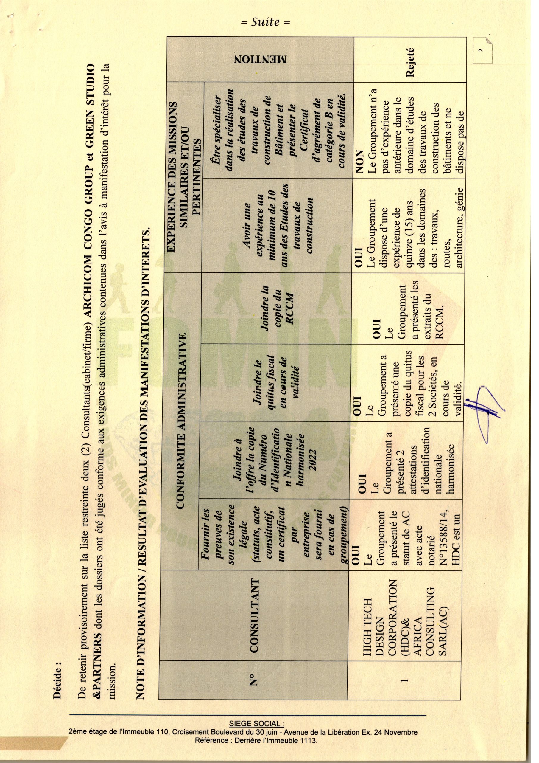 Attribution provisoire accordée aux deux (2) consultants (cabinet/firme) ARCHICOM CONGO GROUP et GREEN STUDIO & PARTNERS relative au marché de recrutement d’un consultant pour assurer le contrôle et la surveillance…