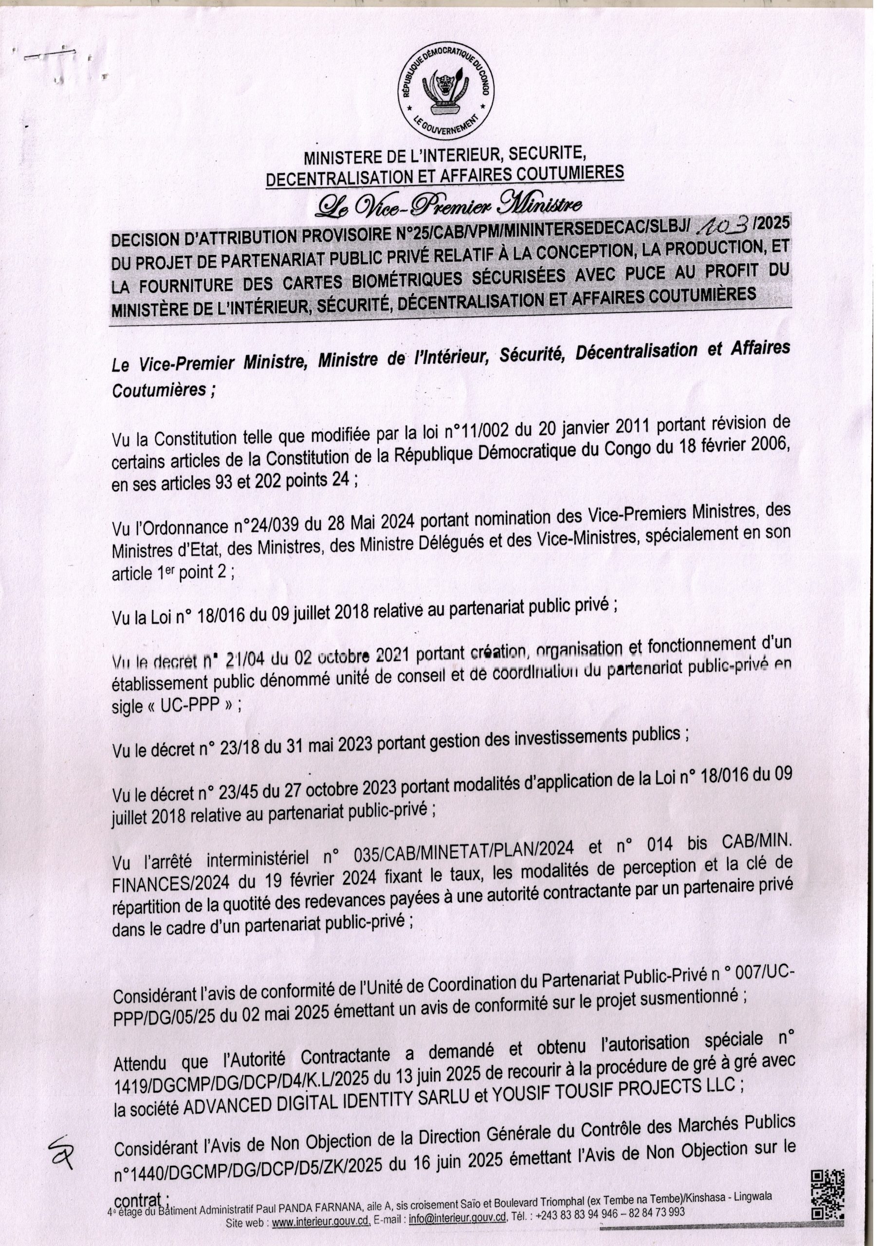 Attribution provisoire accordée aux sociétés “ADVANCED DIGITAL IDENTITY SARLU” et “YOUSIF TOUSIF PROJECTS LLC” le marché de partenariat public-privé à la conception, la production et la fourniture des cartes biométriques sécurisées avec puce au profit du Ministère de l’Intérieur, Sécurité, Decentralisation et Affaires coutûmières.