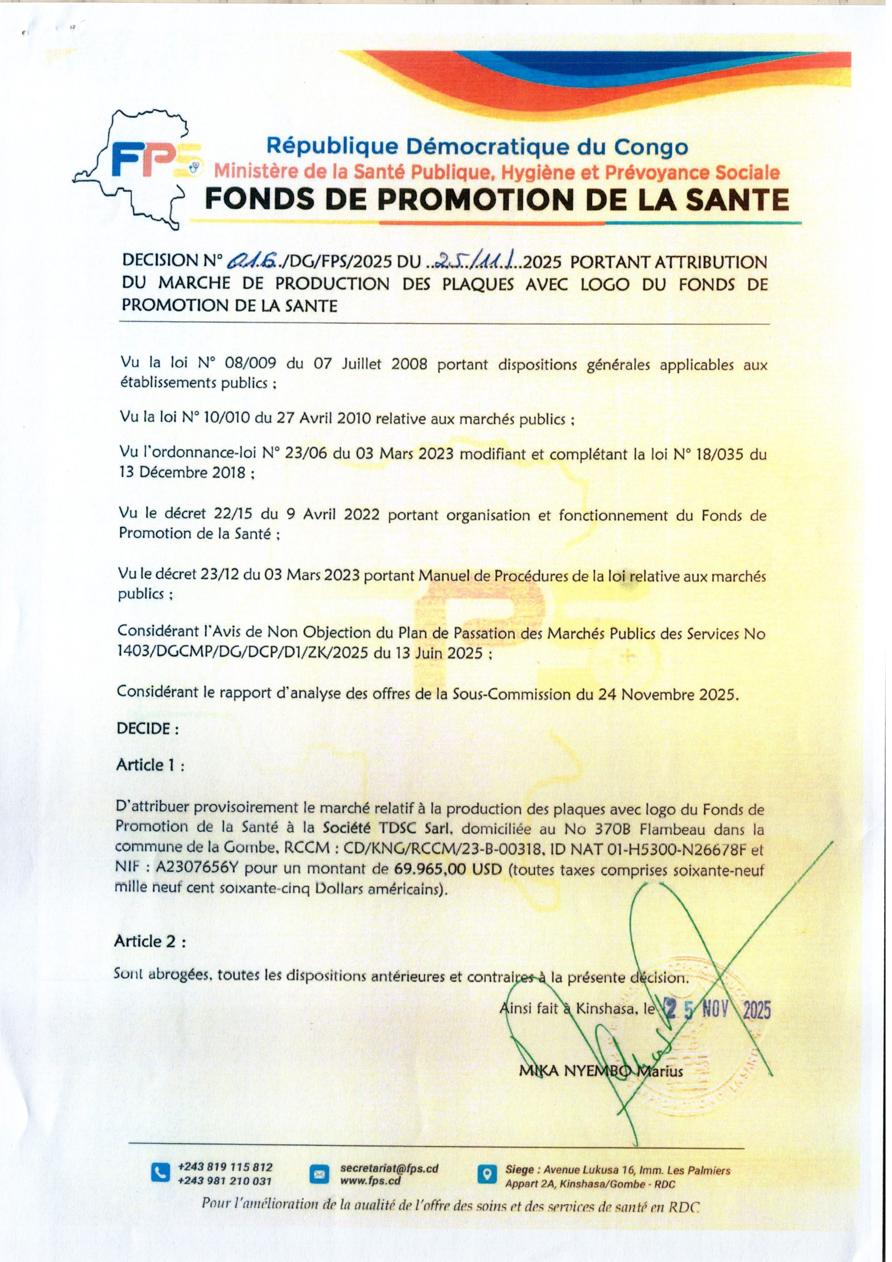 Attribution provisoire accordée “TDSC sarl” relative au marché de la production des plaques avec logo du Fonds de Promotion de la Santé.