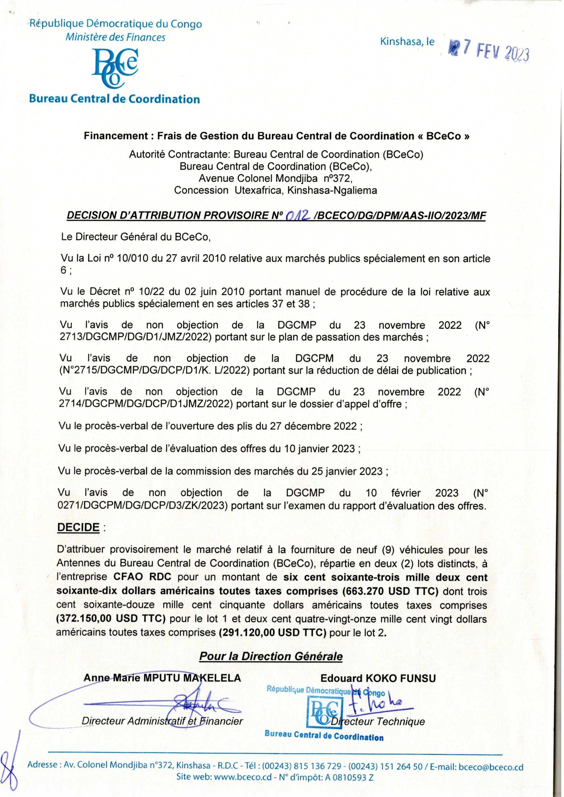 Attribution provisoire de la BCECO accordée à la CFAO RDC relative à la fourniture de neuf (9) véhicules pour les Antennes du Bureau central de Coordination (BCECO), répartie en deux (2) lots distincts.