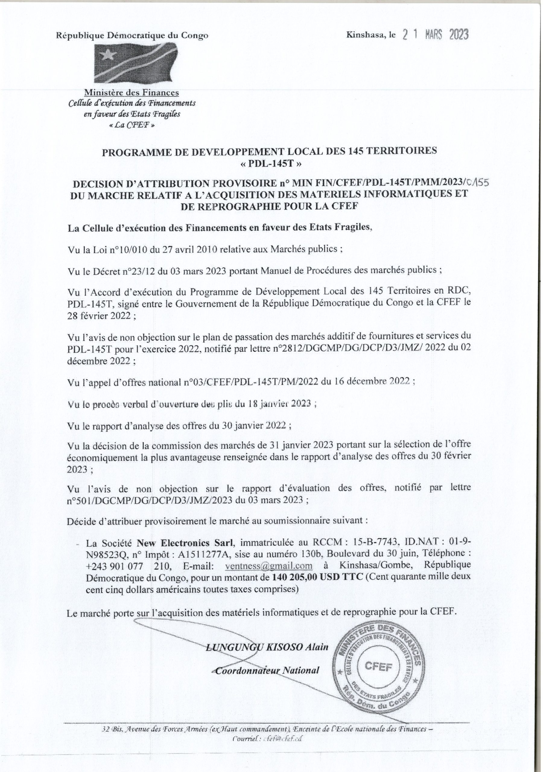 Attribution provisoire de la CFEF accordée à la société New Electronics relative à l’acquisition des matériels informatiques et de reprographie pour la CFEF.