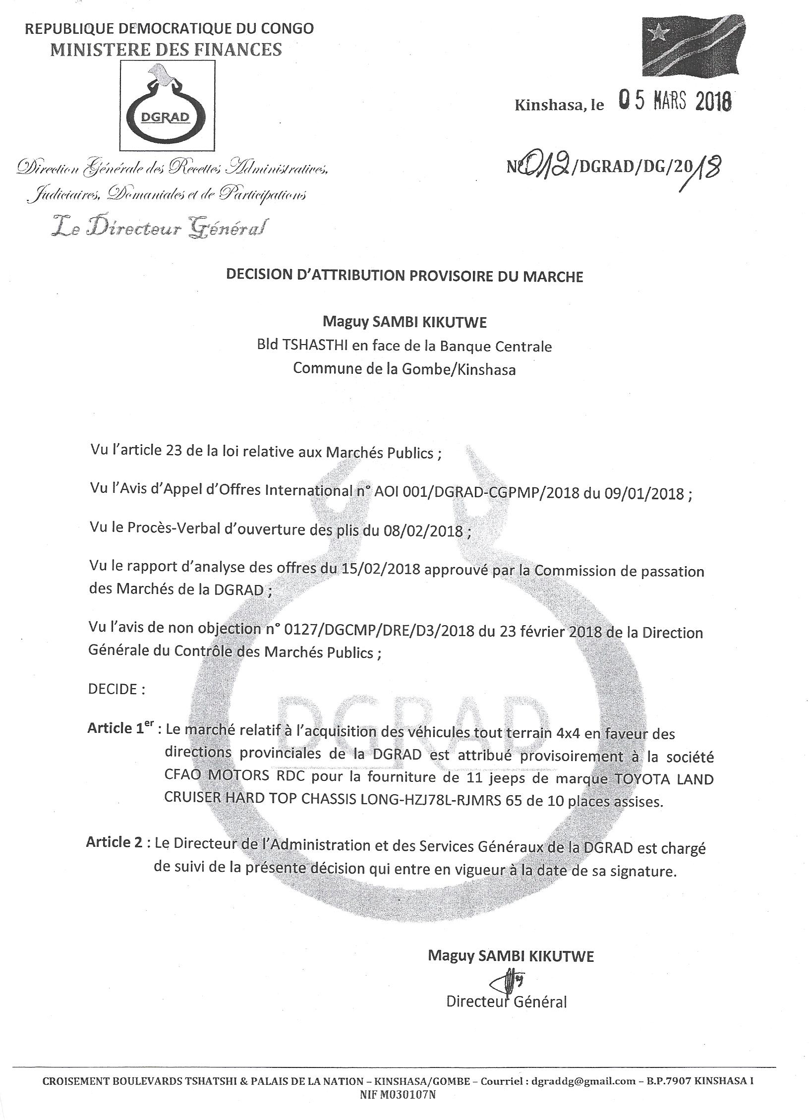 Attribution provisoire de marché d’acquisition des 11 jeeps de marque Toyota land cruiser hard top châssis long-hzi78l-rjmrs 65 de 10 places assises en faveur de la DGRAD à la société CFAO MOTORS RDC.