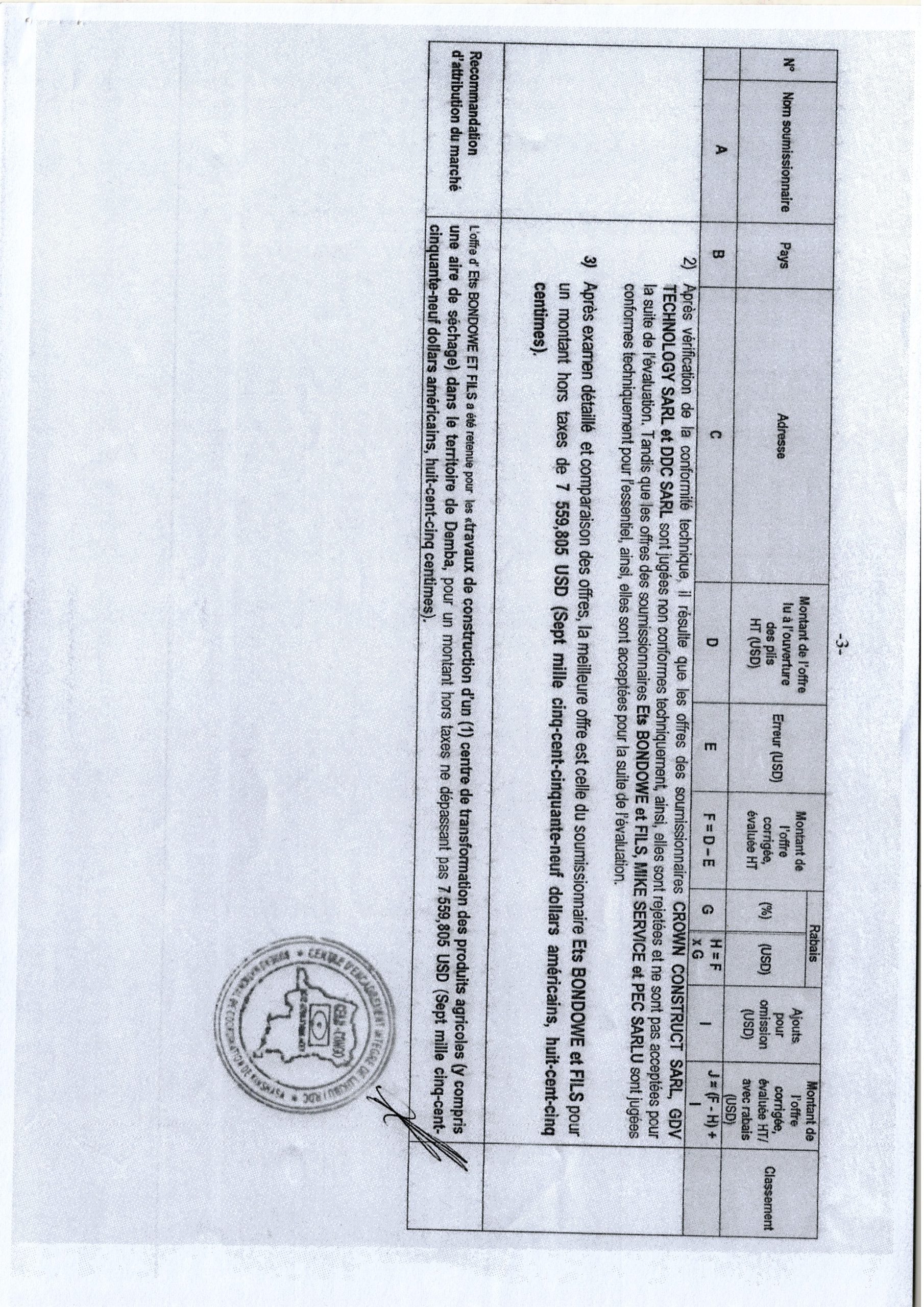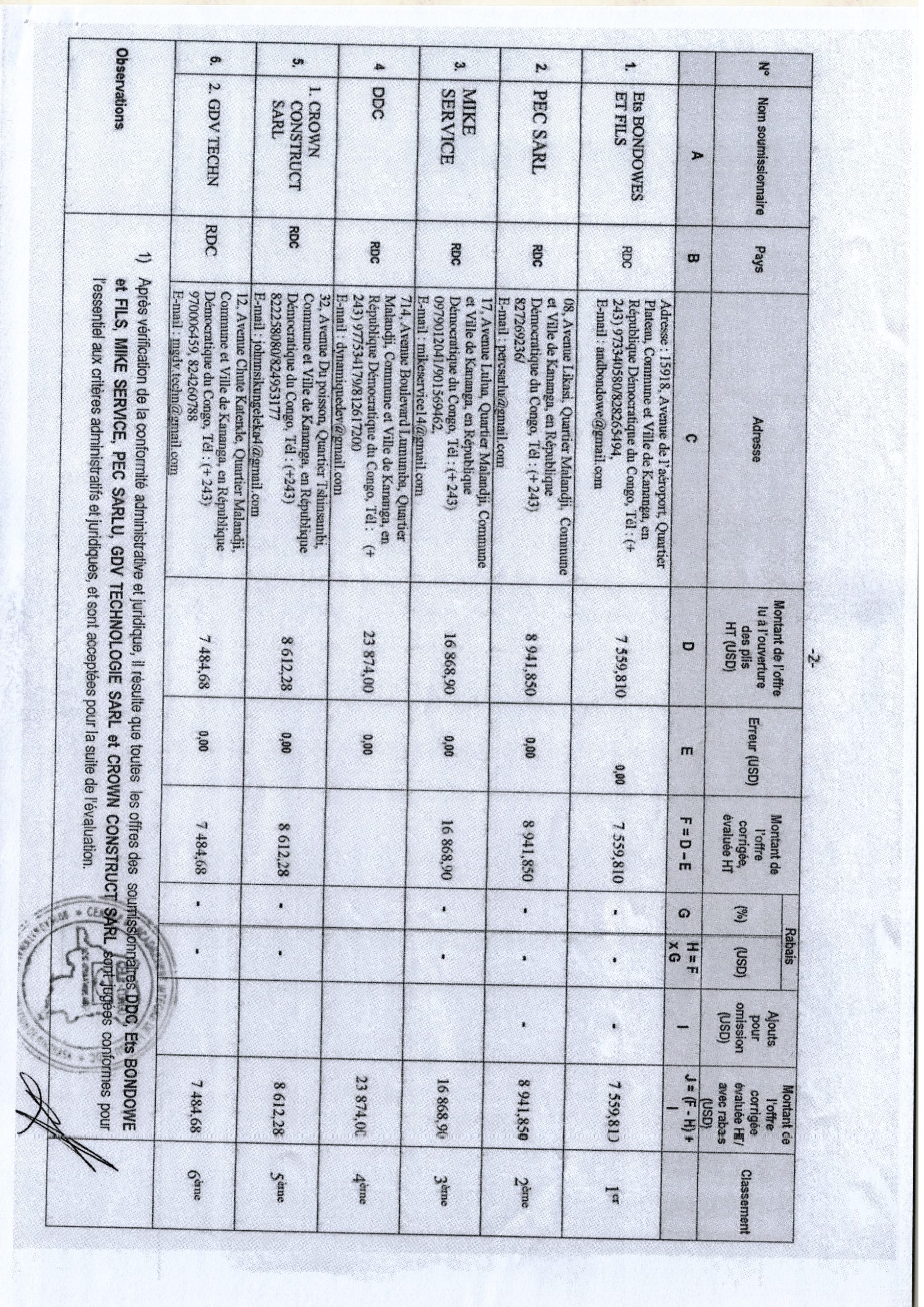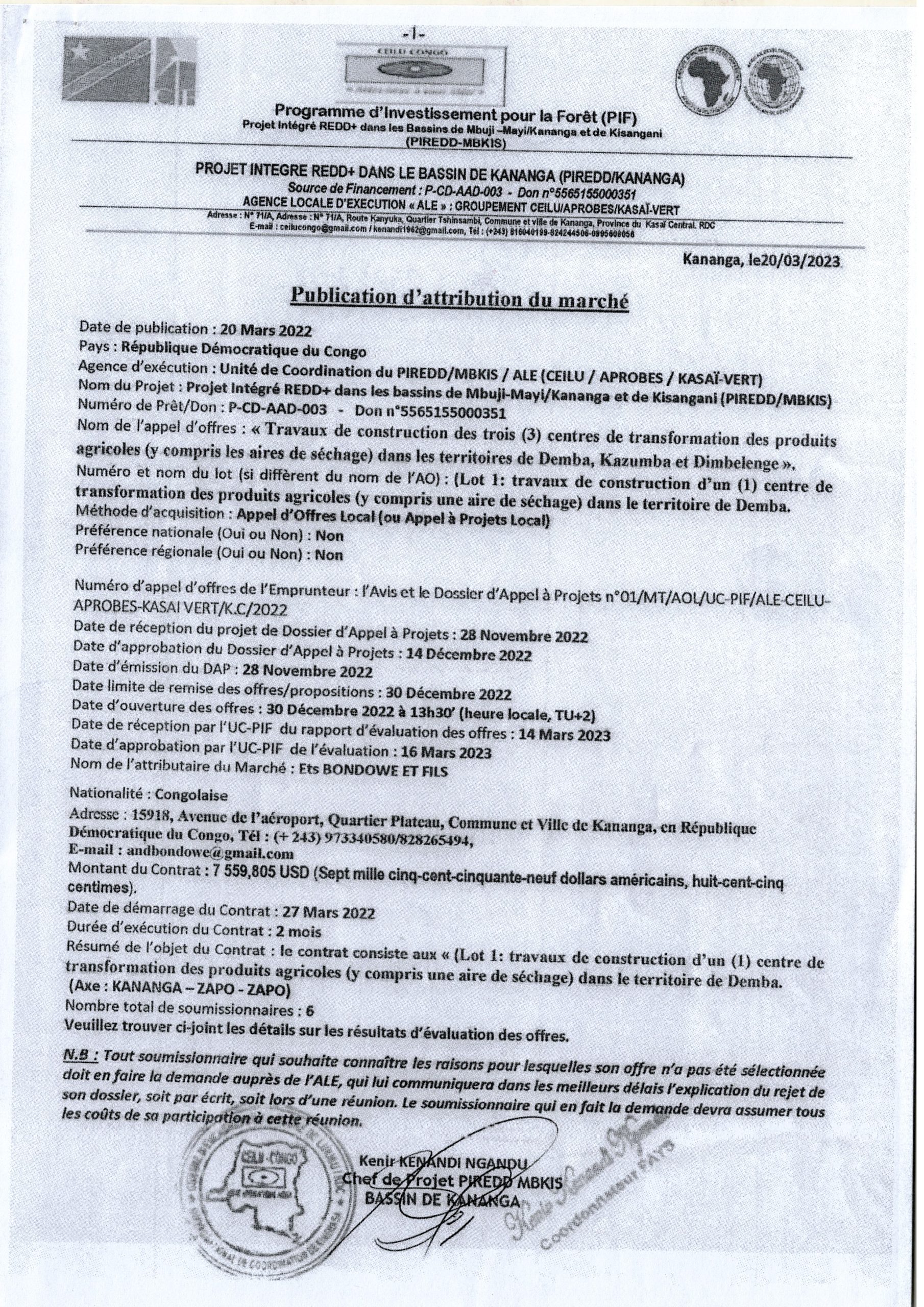 Attribution provisoire de PIREDD-MBKIS Accordée à Ets BONDOWE ET FILS relative au travaux de construction d’un (1) centre de transformation des produits agricoles (y compris une aire de séchage) dans le Territoire de Demba. (lot 1)