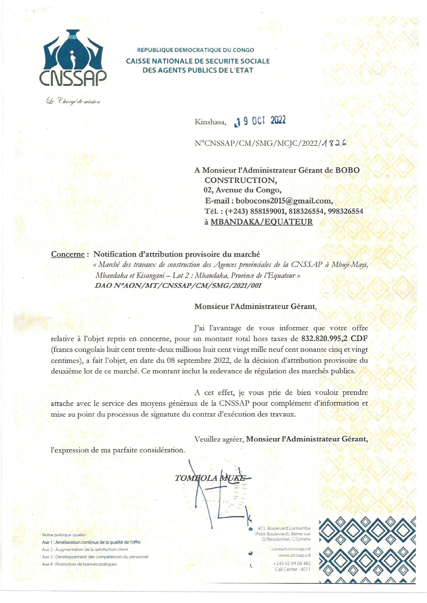 ATTRIBUTION PROVISOIRE DU MARCHE A MONSIEUR L’ADMINISTRATEUR GERANT DE BOBO CONSTRUCTION RELATIVE AU MARCHE DES TRAVAUX DE CONSTRUCTION DES AGENCES PROVINCIALES DE LA CNSSAP A MBUJI-MAYI, MBANDAKA ET KISANGANI- LOT 2 : MBANDAKA, PROVINCE…