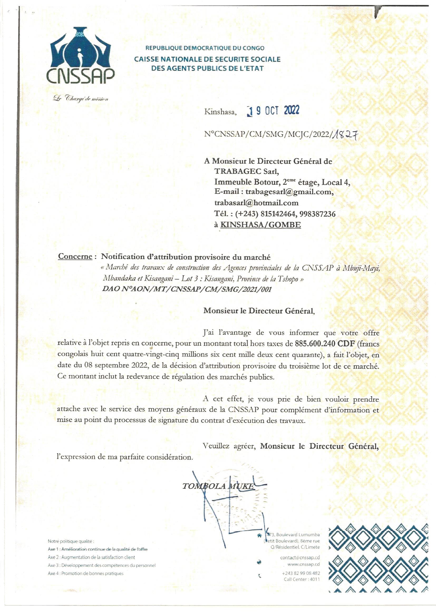 ATTRIBUTION PROVISOIRE DU MARCHE ACCORDEE A MONSIEUR LE DIRECTEUR GENERAL DE TRABAGEC Sarl RELATIVE AU MARCHE DES TRAVAUX DE CONSTRUCTION DES AGENCES PROVINCIALES DE LA CNSSAP A MBUJI-MAYI, MBANDAKA ET KISANGANI- LOT 3 : KISANGANI, ….