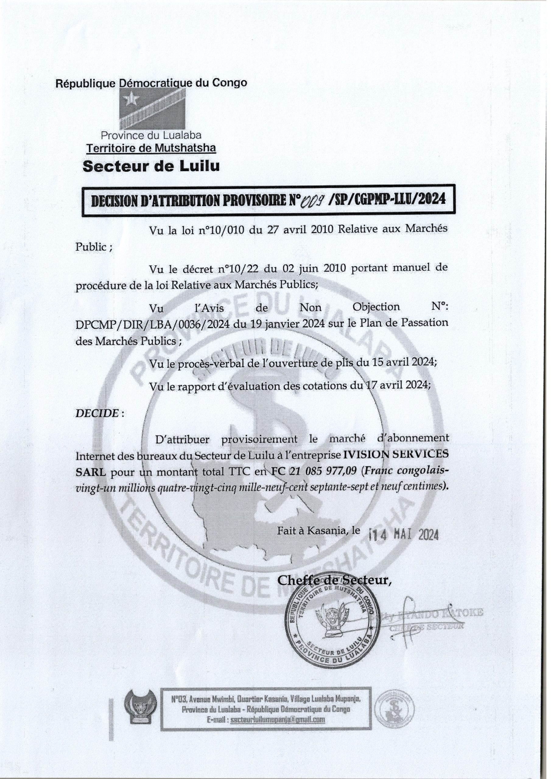 Attribution Provisoire du marché d’abonnement Internet des bureaux du Secteur de Luilu à l’entreprise IVISION SERVICES SARL