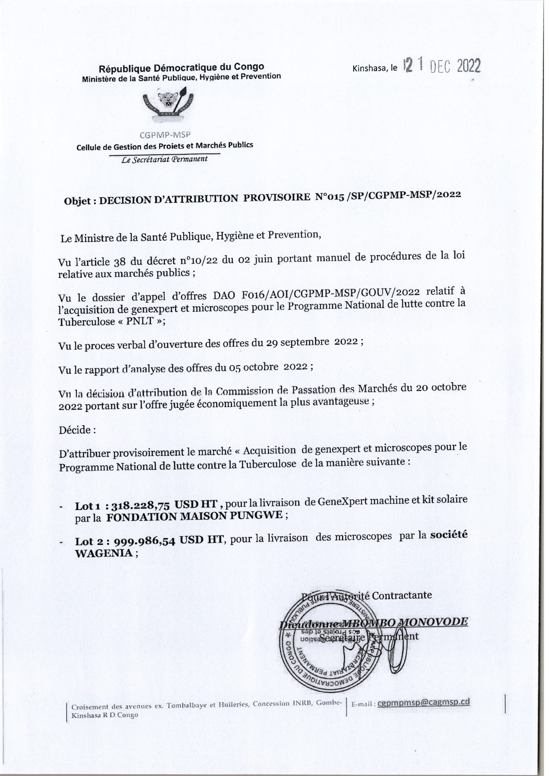 Attribution Provisoire du marché d’Acquisition de genexpert et microscopes pour le Programme National de lutte contre la Tuberculose : Lot 1 à la FONDATION MAISON PUNGWE et lot 2 à la société WAGENIA