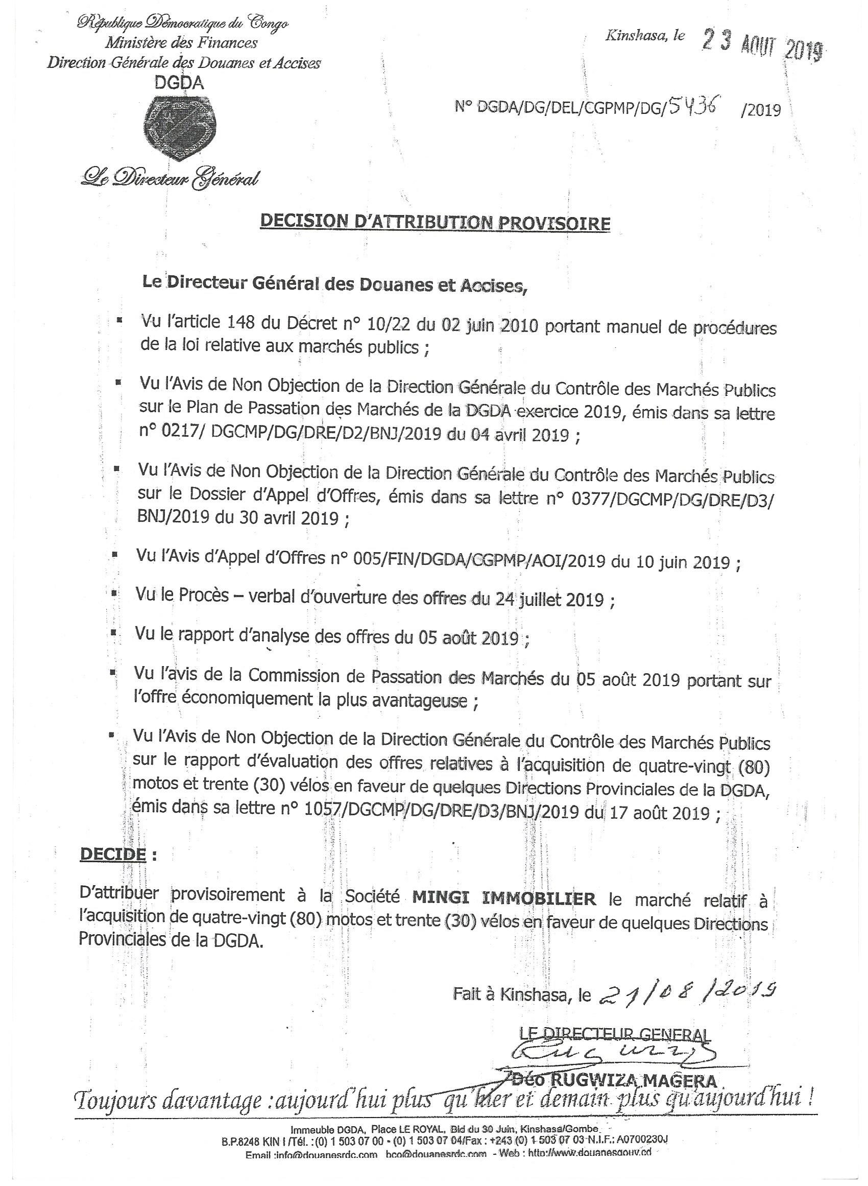 Attribution provisoire du marché d’acquisition de quatre-vingt (80) motos et trente (30) vélos à la société MINGI IMMOBILIER