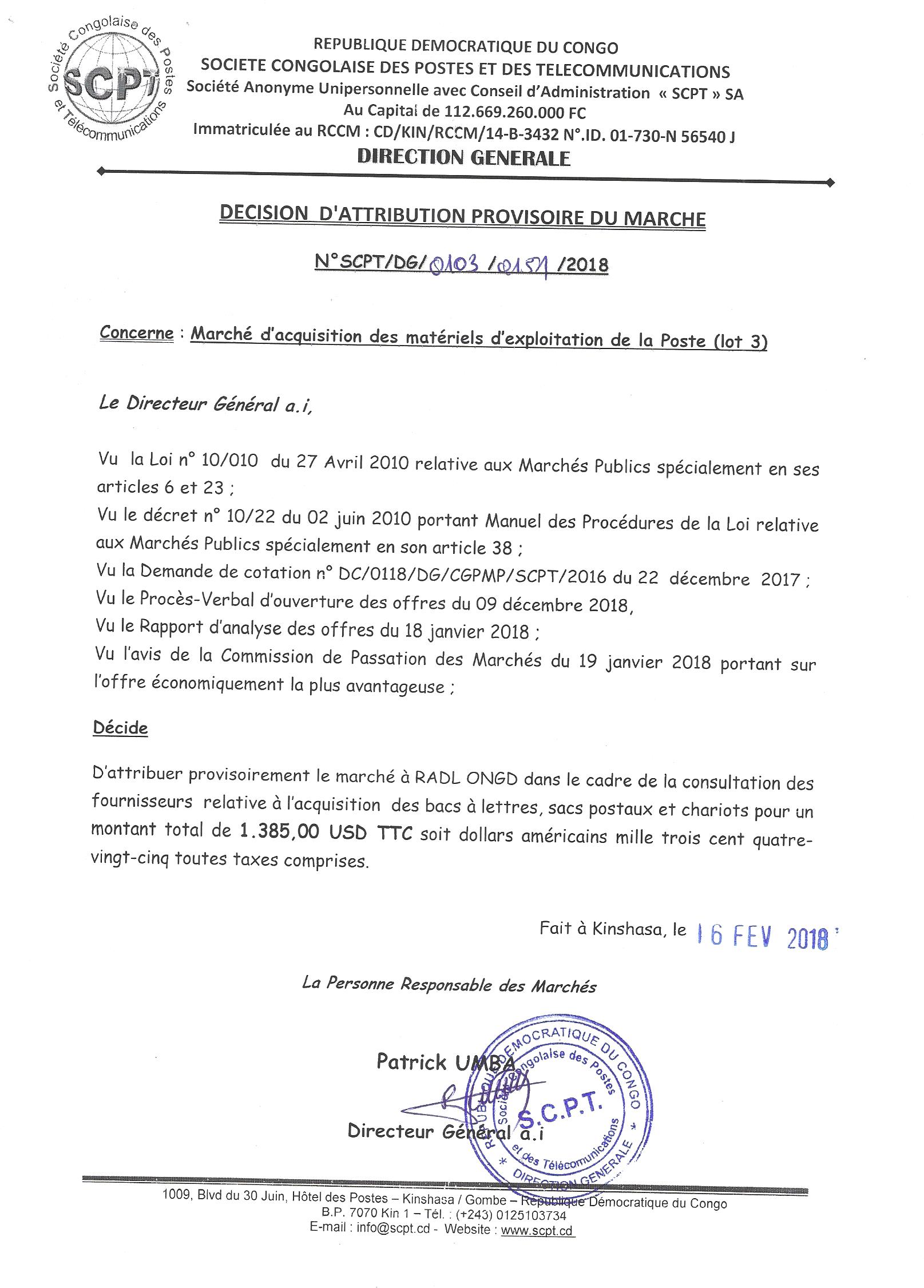 Attribution provisoire du marché d’acquisition des bacs à lettres, sacs postaux et chariots à radl ongd.