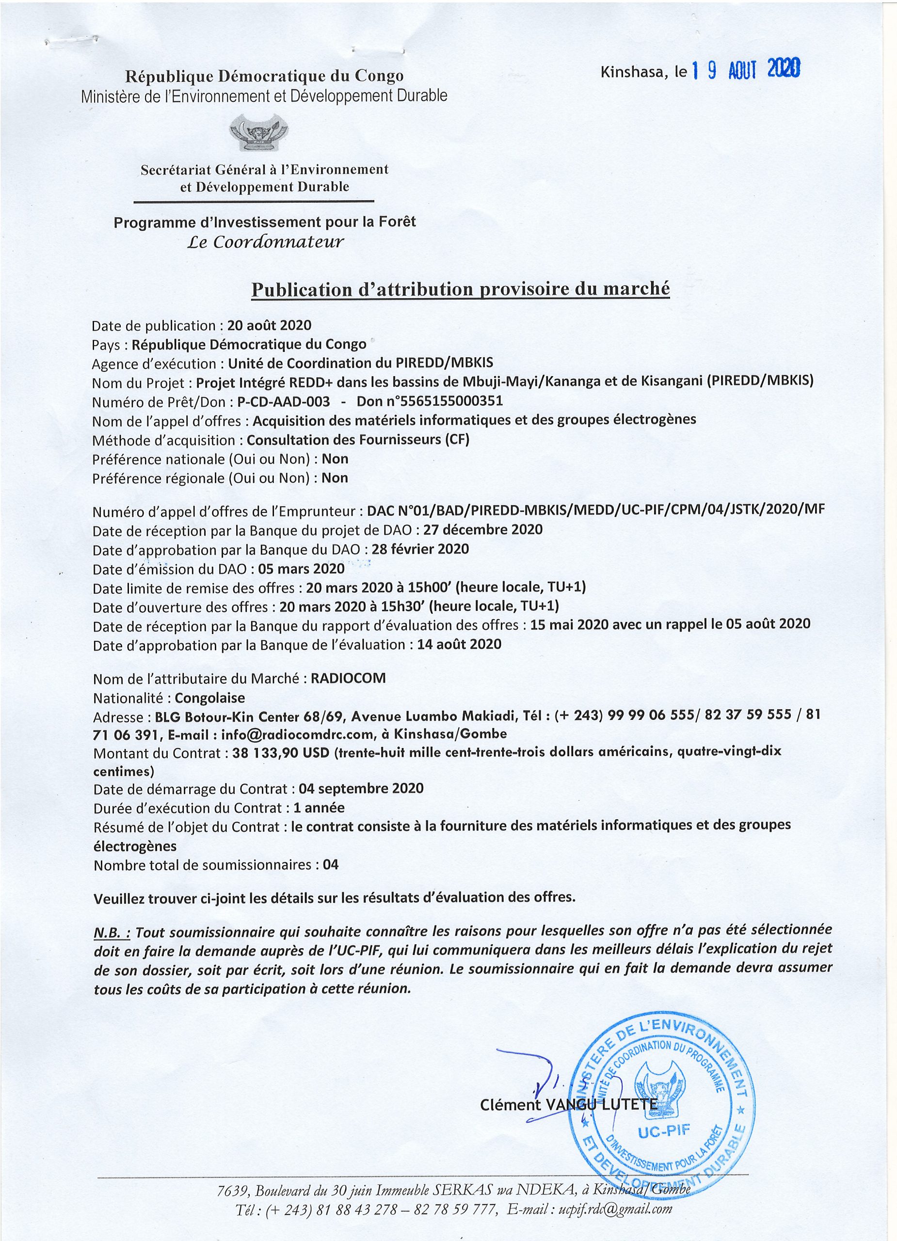 Attribution provisoire du marché d’acquisition des matériels informatiques et des électrogènes à RADIOCOM