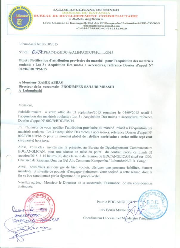 Attribution provisoire accordée à PRODIMEX SA /LUBUMBASHI du marché relatif à l’acquisition des matériels roulant,Lot3.