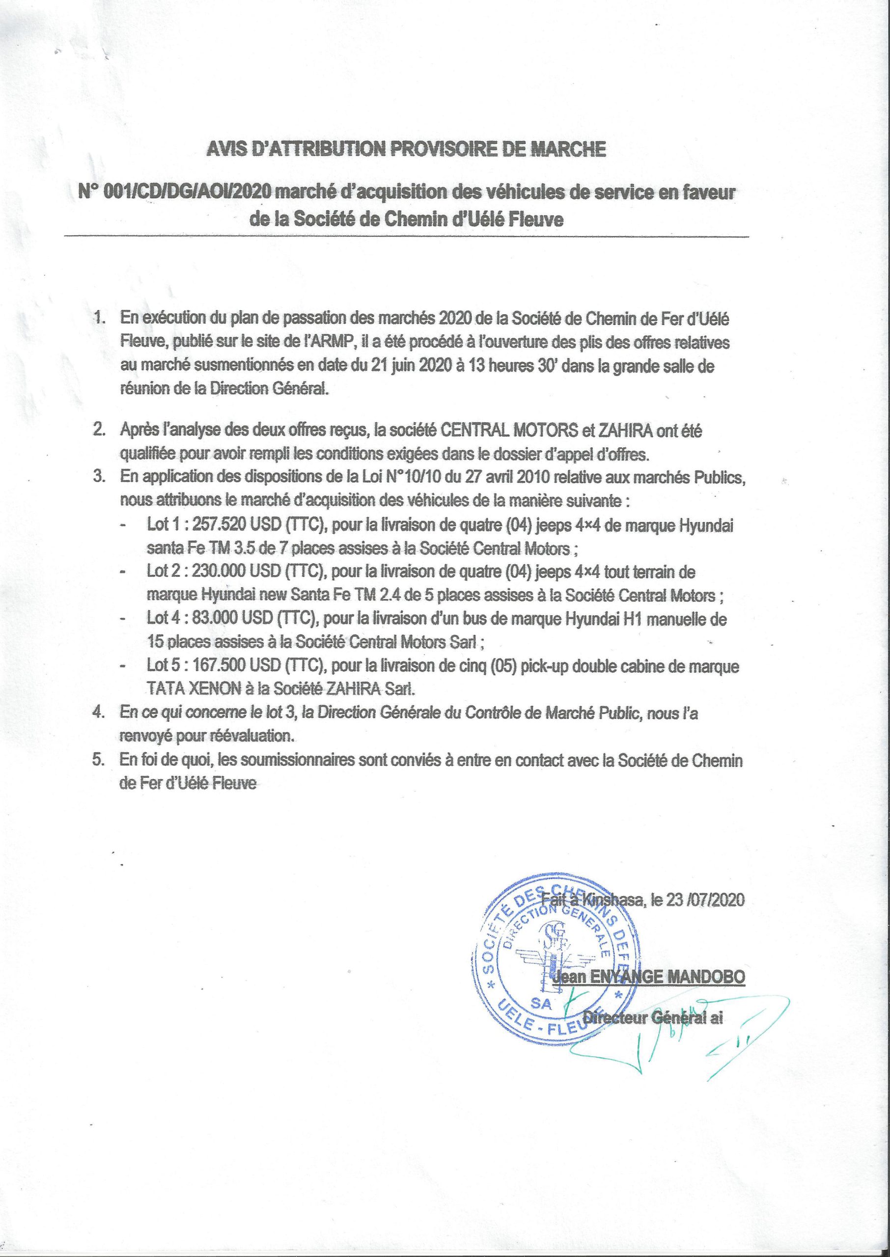 Attribution provisoire du marché d’acquisition des véhicules de service en faveur de la société de chemin d’Uélé fleuve à la société CENTRAL MOTORS et ZAHIRA SARL