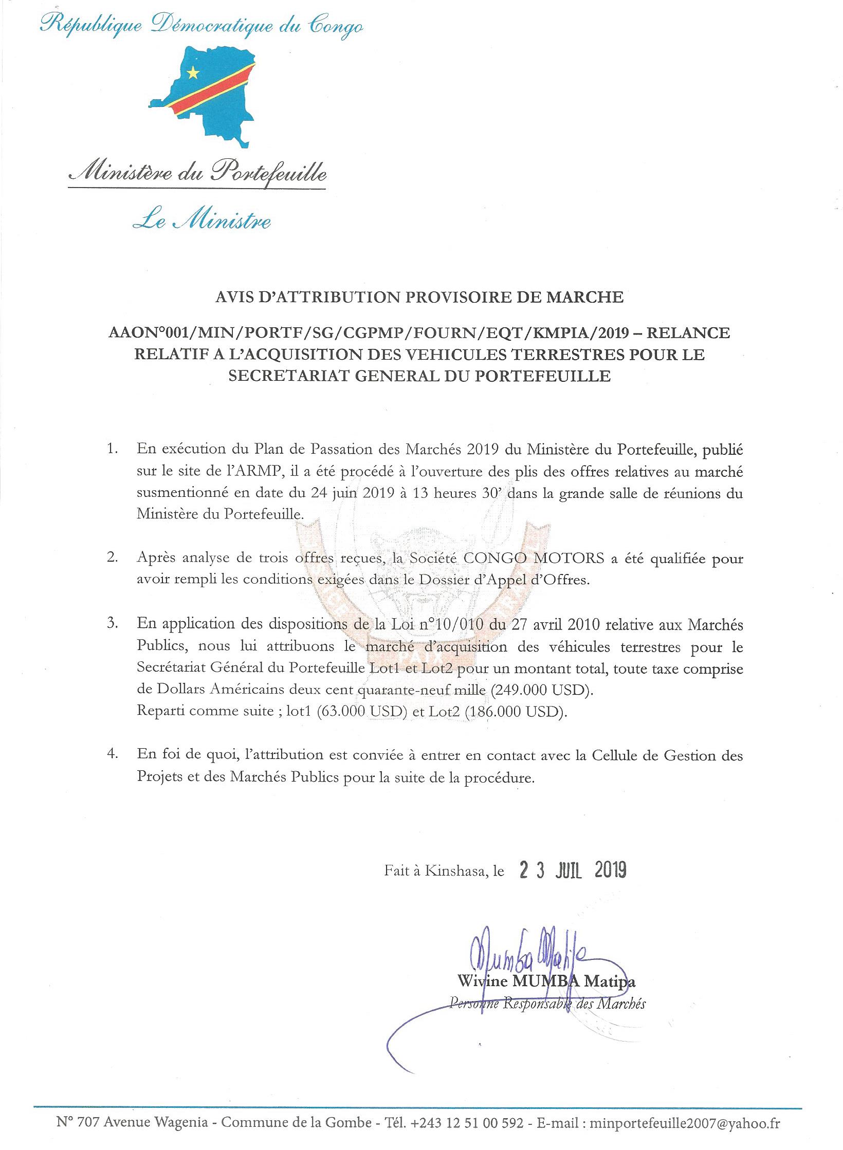 Attribution provisoire du marché d’acquisition des véhicules terrestre pour le secrétariat général du portefeuille à la société CONGO MOTORS.